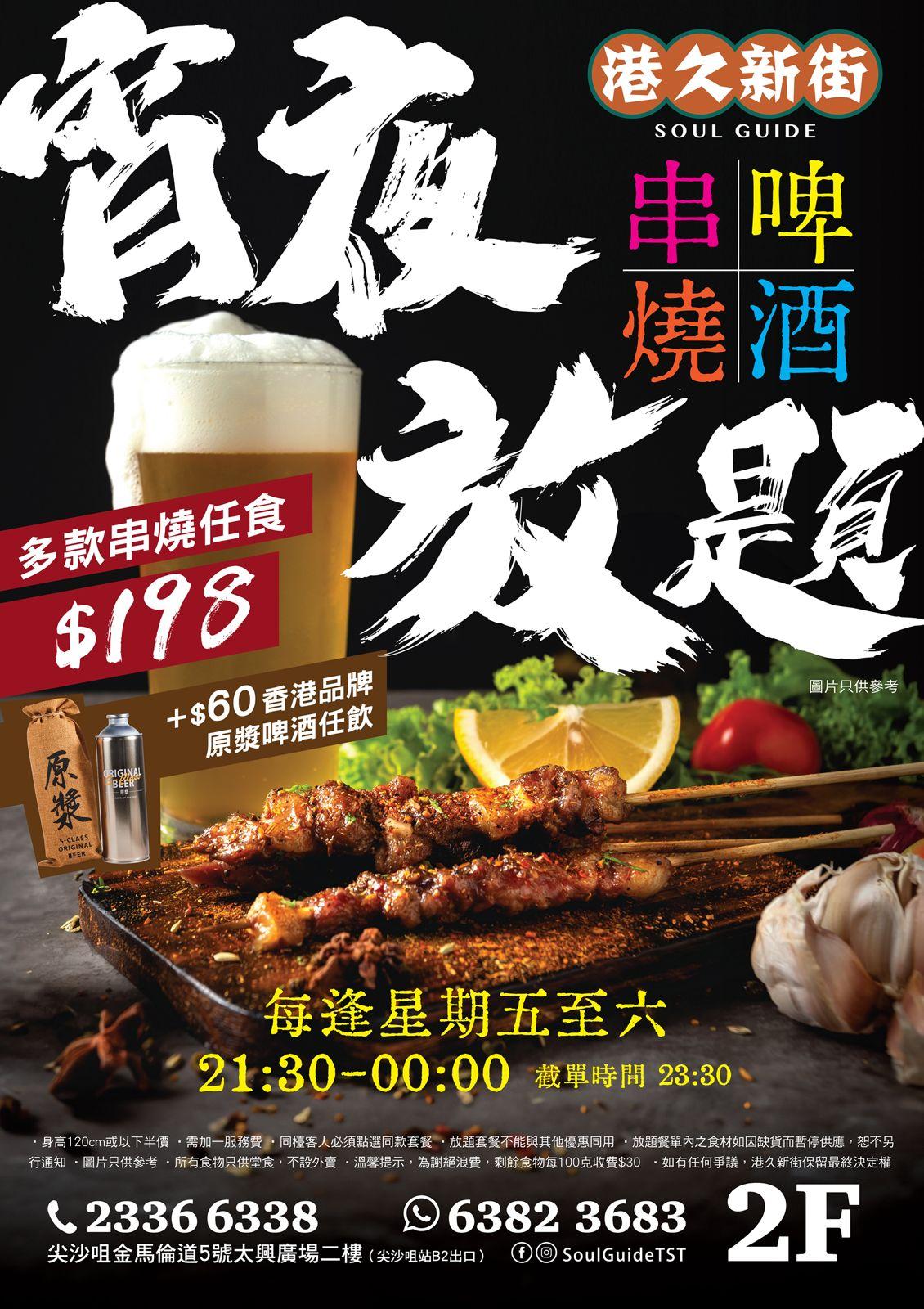 逢星期五及六晚上9:30後,只需$198即享150分鐘串燒啤酒宵夜放題,任食20多款即叫即製惹味串燒,額外加$60更可享香港品牌S Class原漿啤酒任飲,任食任飲感受夜繽紛!