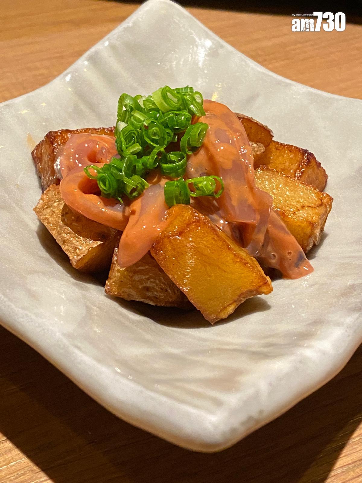 佐酒怎缺少串燒?豚腩串燒3味嚴選日本稀有的Kamikomi豚肉,分別佐以酸汁蘿蔔蓉、蒜蓉味噌及鹽京蔥三種惹味醬汁,更突出豐腴肉香。玉子燒吃得多,香蔥豆腐章平燒倒是較少見,靈感源於大阪風燒餅,將豆腐壓碎代替麵粉,拌入蛋漿燒製而成,最後加上沙律醬和木魚花提香,置於鐵板上保溫。