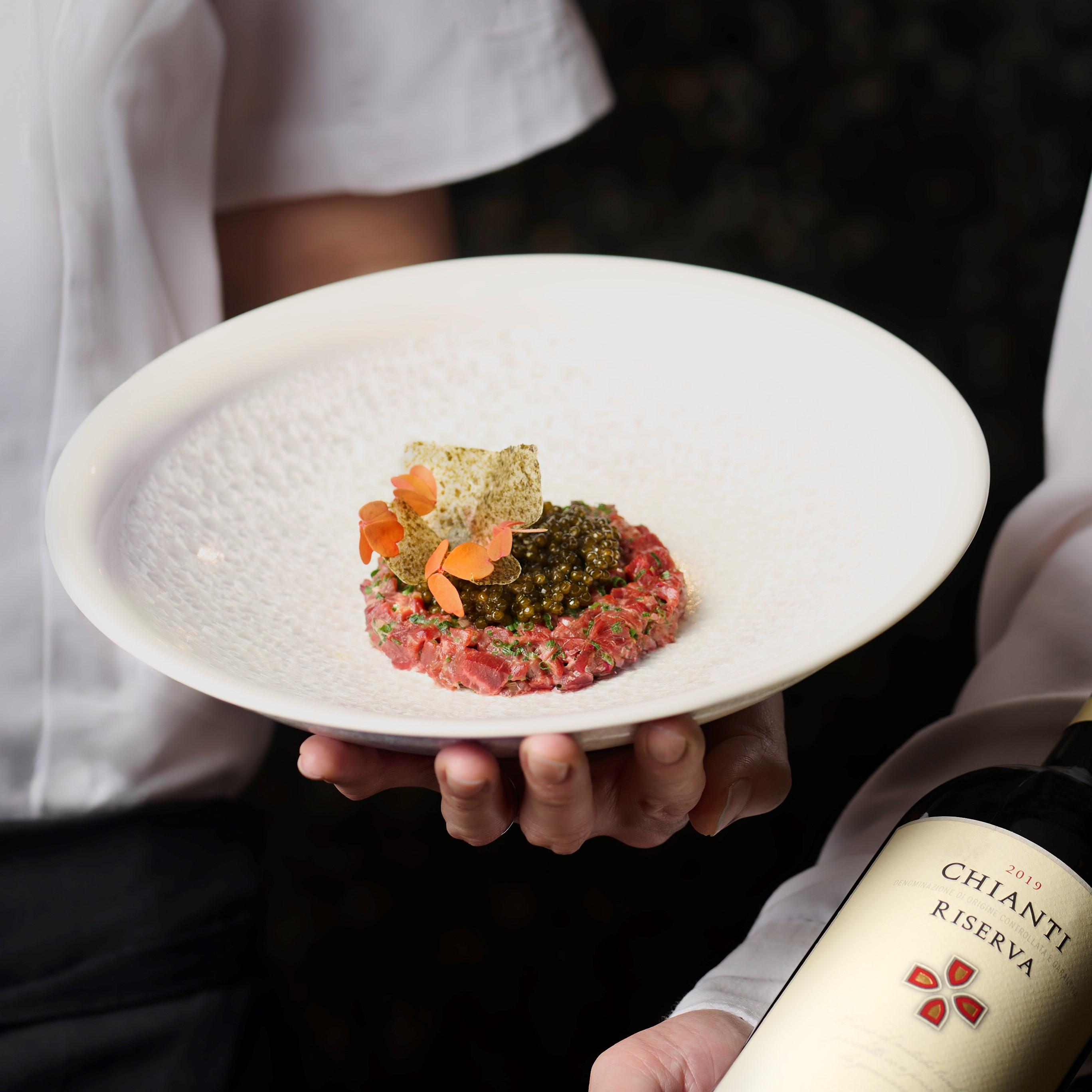 「和牛醇酒饗宴」菜單由主廚William Lau設計,融會法式精巧烹調技藝及日本匠人精神,當中前菜包括「法國頂級Polmard牛肉他他」,精選法國巴黎百年肉商Polmard的出品,配上愛心造型的海苔窩夫,伴以七味紅桑子,成就多重味覺享受;如欲昇華品味體驗,更可以優惠價為菜式配上頂級「Petrossian Royal Ossetra魚子醬」。而「牛尾意大利雲吞」則搭配風乾火腿及煙燻牛油,細膩風味教人一試難忘。