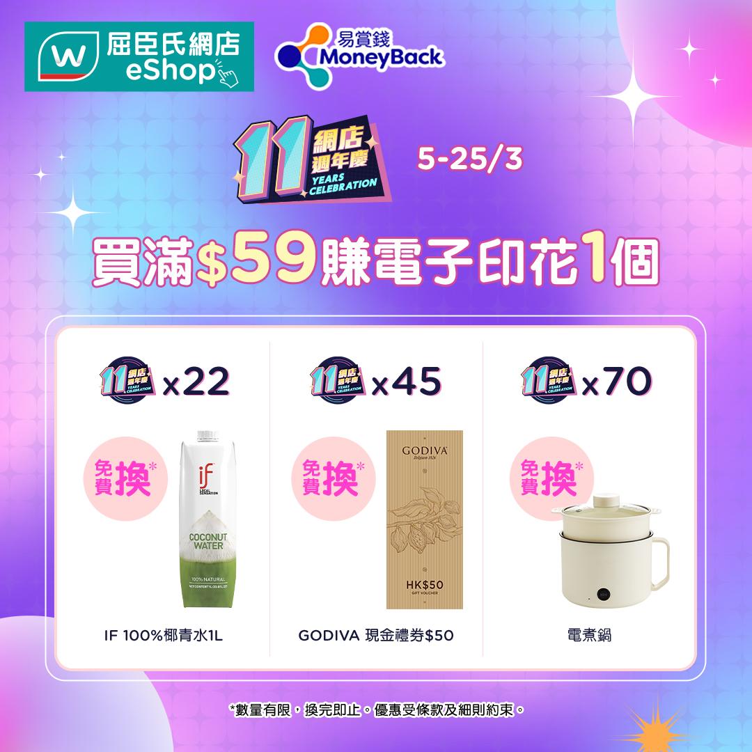 - 購物淨額每滿$59即可獲贈一個電子印花,儲滿指定數量即可免費換領各種實用禮品。