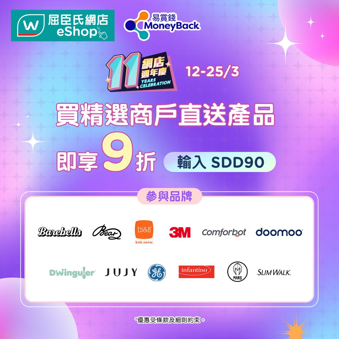 - 於2025年3月12日至25日期間,易賞錢會員於屈臣氏網店購買12大精選商戶之直送產品,輸入優惠碼【SDD90】,相關產品即享9折優惠 。