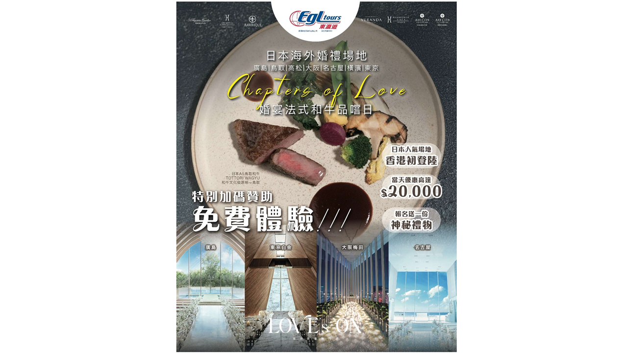 日本婚禮行業巨頭Take and Give Needs(T&G)與EGL東瀛遊旗下品牌Love's On海外婚禮專門店聯手,正式進軍香港市場!Love’s On累積已為超過1000對新人安排前往日本舉辧婚禮。為讓準新人近距離感受日式婚禮的精髓,T&G集團代表將於10月18及19日在香港舉辦日式和牛宴會體驗日,每日分別安排兩個時段(11:30 AM – 1:00 PM / 2:30 PM - 4:00 PM),參加者可親身感受日式和牛宴會,T&G代表更會介紹日本最受歡迎的婚禮場地,即場報名可享高達港幣$20,000專屬優惠!
