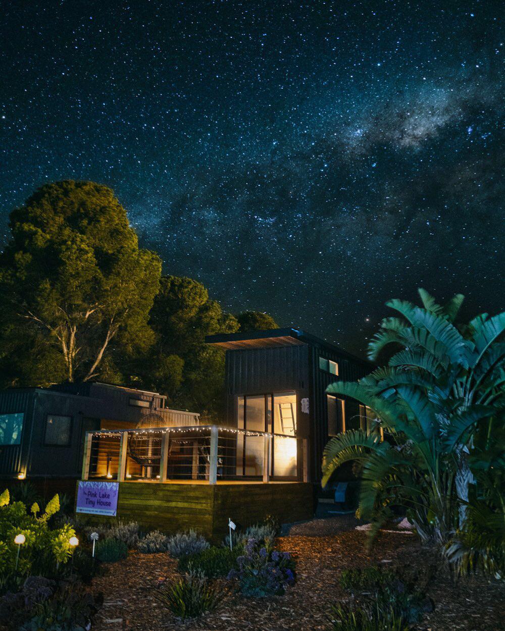 粉湖小巧屋(Pink Lake Tiny House & Camping)位置則正對著澎湃湖,可以在豪華舒適的環境中,欣賞小屋正前方粉紅湖的壯麗景色。結合溫馨舒適的小木屋住宿與豐富戶外體驗,夜晚會舉辦戶外燒烤晚宴及澳式戶外篝火晚會,並有 Billy Tea 泡茶示範、棉花糖烤製活動,營造濃厚澳洲戶外文化氛圍。清澈星空下的觀星活動更為夜晚增添一份浪漫與寧靜,讓旅客感受難忘的澳洲自然風情。