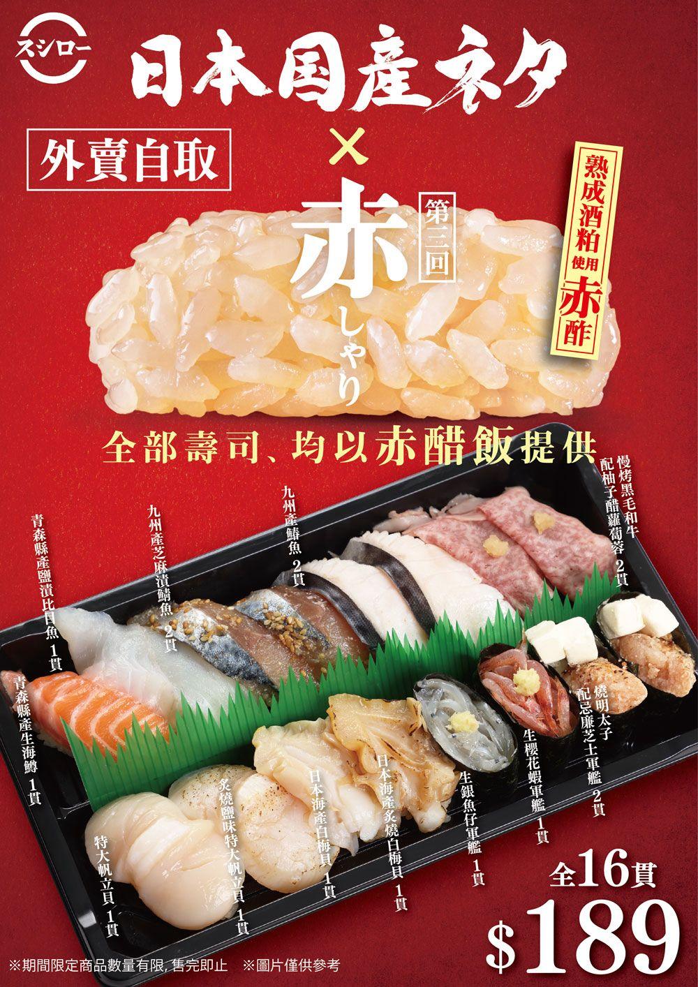 除了可以堂食用餐外,另推期間限定【日本國產🇯🇵X赤醋飯】外賣盛合,將「江戶前」鮮味帶回家慢慢品嚐!外賣盛合只限壽司郎外賣自取,Deliveroo不設販售。外賣自取商品數量有限,售完即止。