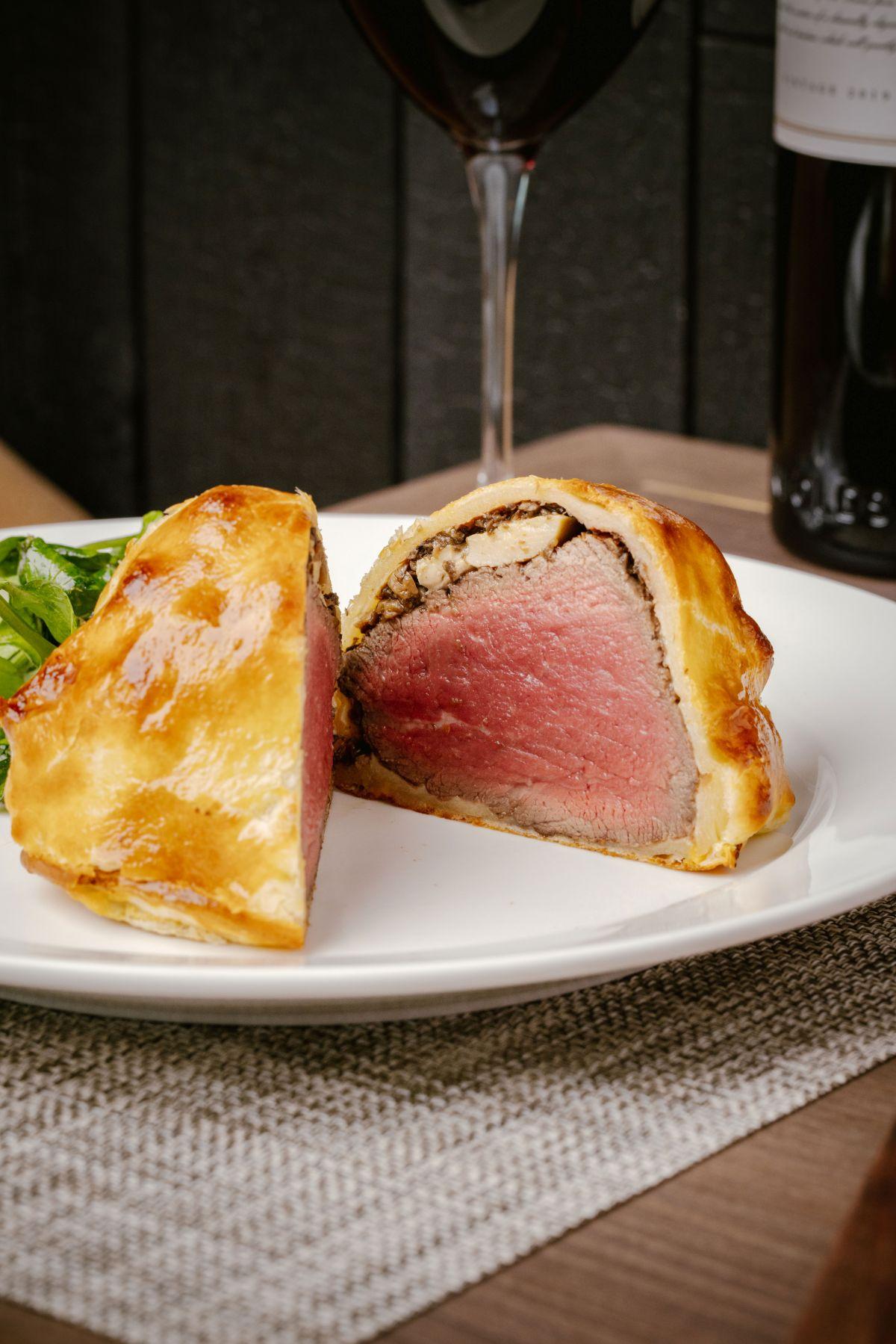 餐牌更提供多種牛扒優質部位,包括澳洲西部榖飼200天的西冷,肉香厚重,濃而不膩。昆士蘭肉眼油花分布密集,肉汁豐盈油香四溢。另有來自科羅拉多州杉河農場的USDA Prime美國極佳等級肉眼及西冷,肉香濃郁,肉質柔嫩。除了用澳洲草飼牛柳夾着鵝肝、雜菌松露醬和意式火腿的圓頂型威靈頓牛柳,也特製坊間少見的羊肉威靈頓,用酥皮包裹羊柳和雞肉慕絲,配搭羊奶芝士及迷迭香紅酒汁。素食版的香薯皮蒂維耶酥皮威靈頓,內有磨菇濃湯和格呂耶爾芝士,鮮香層遞而出。