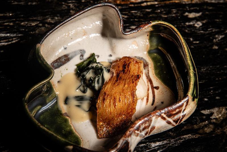 餐單按照季節而定,秋冬必備蟹料理。清蒸新鮮北海道毛蟹拆肉後,連蟹膏放在蟹蓋內,再放上用了超過3小時製作的龍蝦汁寒天啫喱。奉上給客人時,以香水瓶噴上貴州茅台酒,添上一抹酒香,更提升蟹的鮮甜。如櫻花形態的松葉蟹燒賣,席前即包即蒸,用上新鮮莧菜萃取汁液揉製成燒賣皮,配京都黑醋與柑橘絲,托出蟹肉的鮮美,最後灑上鹹蛋黃碎添上鹹香。季節刺身如深海池魚配陳皮鹽、池魚細切伴蔥蓉、炙燒醋鯖魚,一次過可細嘗不同食法和風味;壽司飯赤醋酸味突出刺激胃口。