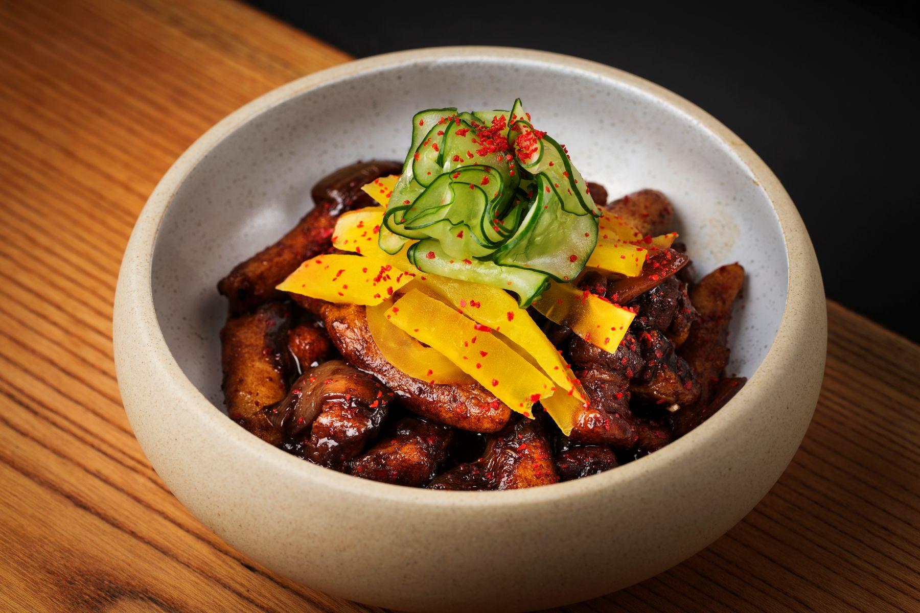 炸醬年糕選用韓國粗條年糕,Q彈軟糯,配以黑豆醬、豬肉末與洋蔥熬製的醬汁燴煮,佐以溏心鵪鶉蛋,風味濃郁飽肚。清爽的拌蕎麥麵食法有新意,配以微焦甜味的焦化泡菜,加上紫蘇油與鹹香醬油,增添獨特香氣。