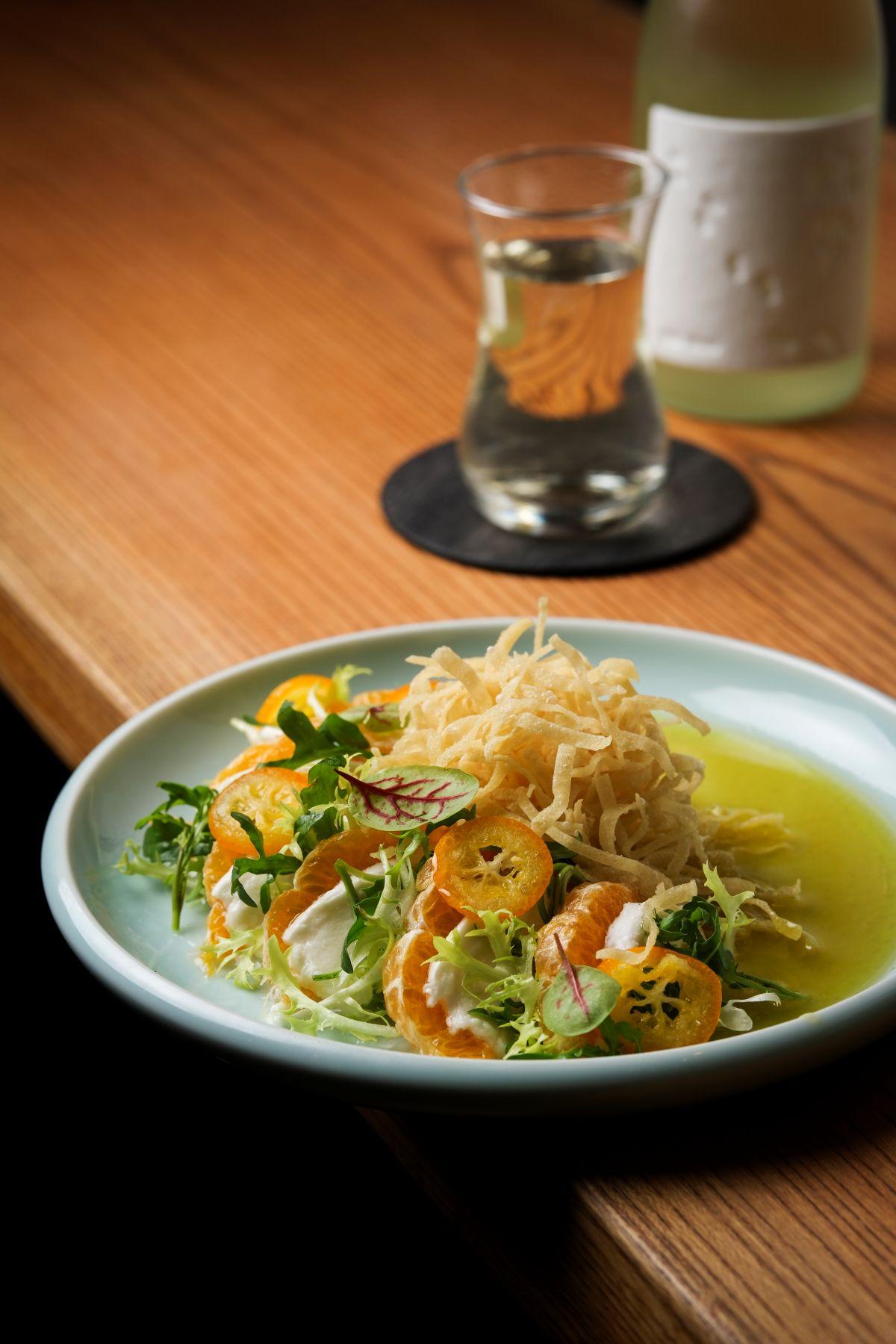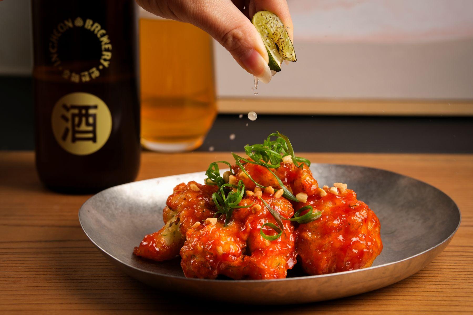 前菜推介韓式牛肉他他,手切保留細膩質感,佐以酥脆海苔片,綴上充滿海洋氣息的魚子醬,最後澆上甘醇醬油釉,一口吃出豐富層次。迷你蟹肉紫菜包飯餡料有鮮甜細嫩的阿拉斯加蟹肉,搭配醃蘿蔔與紫蘇葉,帶出香草的芬芳。韓式辣醬炸椰菜花,將椰菜花炸至金黃酥脆,裹上以韓國辣椒醬、麥芽糖與蘋果茸熬製的甜辣醬,酥脆黏糯,酸甜微辣,復刻韓式炸雞的像真感。
