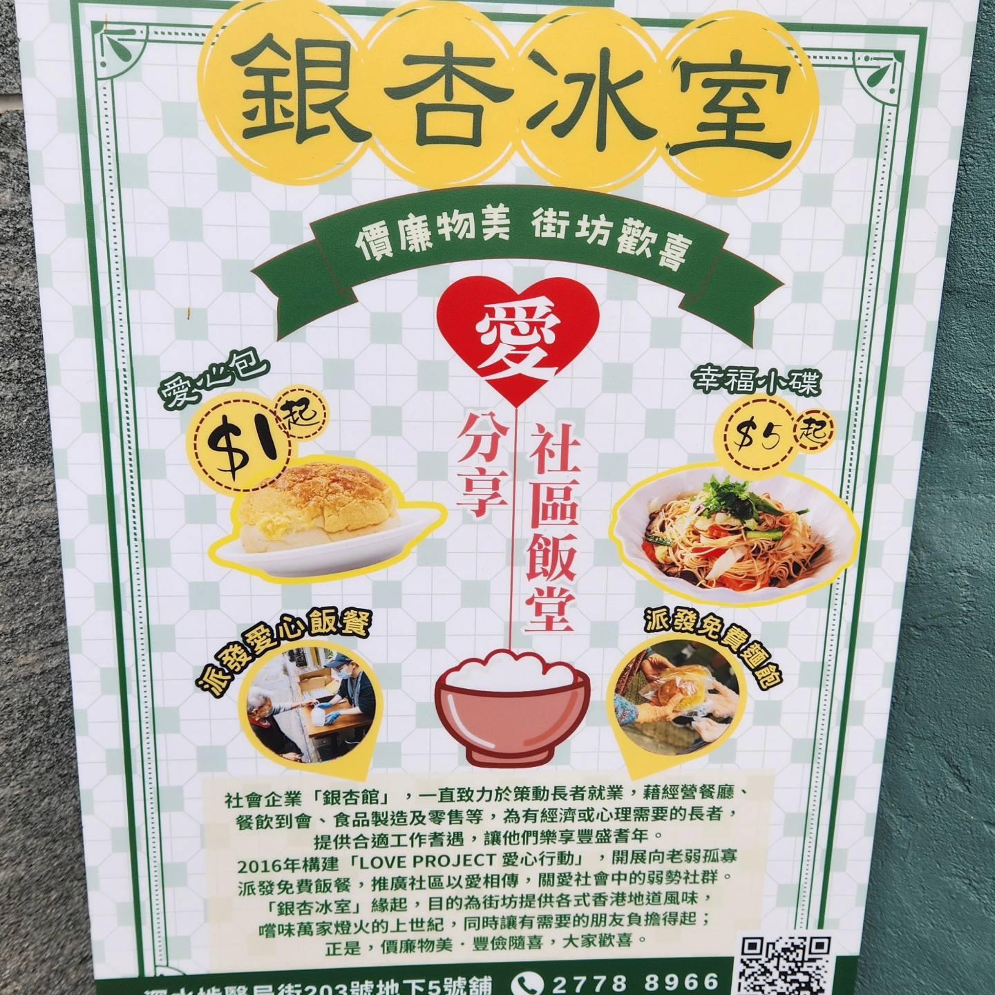 「銀杏冰室」由本地社企銀杏館所開設,選址深水埗醫局街,餐廳由70歲的張師傅主理,用50年真功夫傳承香港味道與情懷。「銀杏冰室」供應價廉物美的平民美食,包括$2無味精健康早餐、$8無化學午餐和$10健康營養無防腐品晚餐,滿足附近街坊三餐。此外亦有免費愛心麵包機「杏福補給站」,特別為貧困人士而設,希望可以幫助到有需要的基層市民。