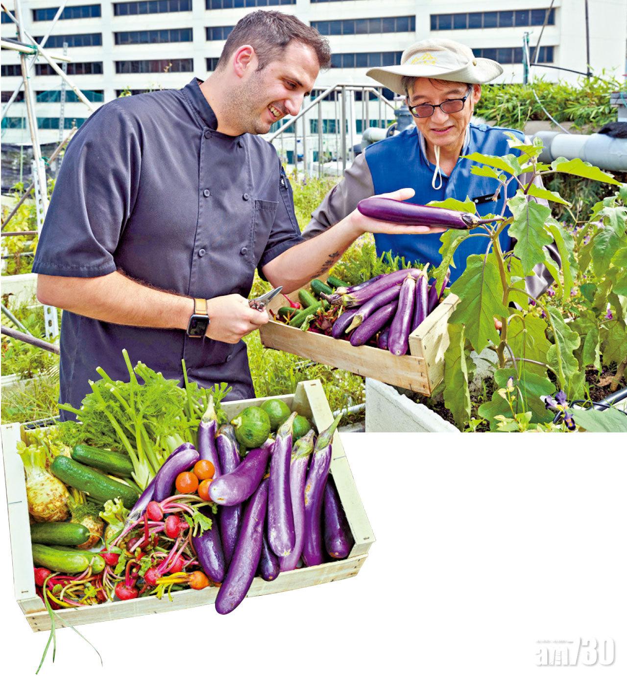 酒店花藝兼園藝師Gentian Tai(右),特地於中文大學修畢園林設計及管理高級文憑課程,悉心照料各種香草、沙律菜、豆類和食用花等供Chef Lee(左)發揮,也足夠讓酒吧裝飾雞尾酒。