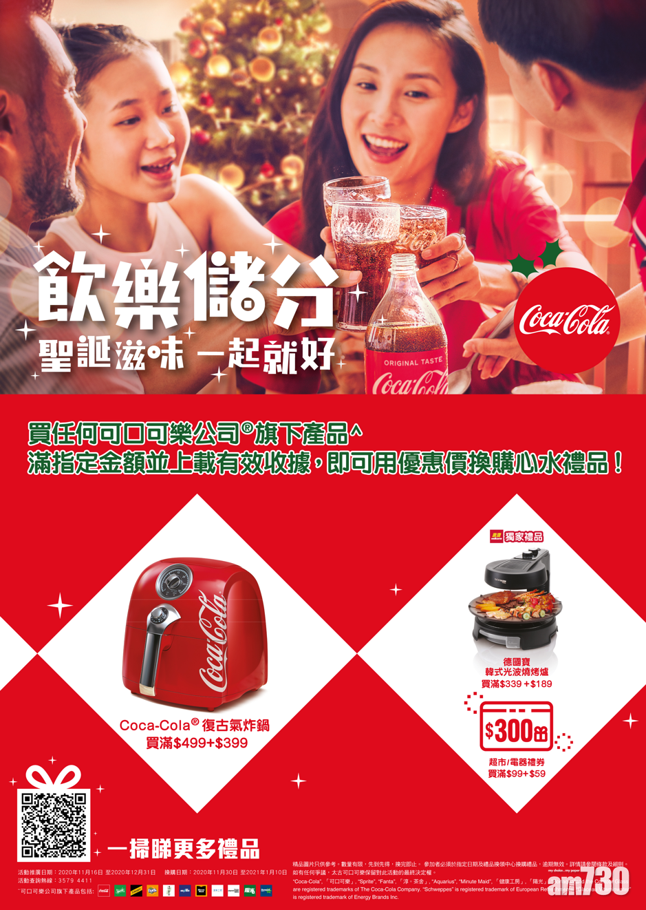 由即日起12月31日,凡於到指定商戶購買任何可口可樂公司旗下飲品,再上載收據副本到icoke.hk網站,就可以獲得積分。累積指定積分後,更可以換購心水禮品,當中包括首次登場的限量版“Coca-Cola”氣炸鍋、「可口可樂」竹纖維廚具套裝及其他精美產品,節日想留在家中大顯廚藝,啱晒烹飪達人一展身手!