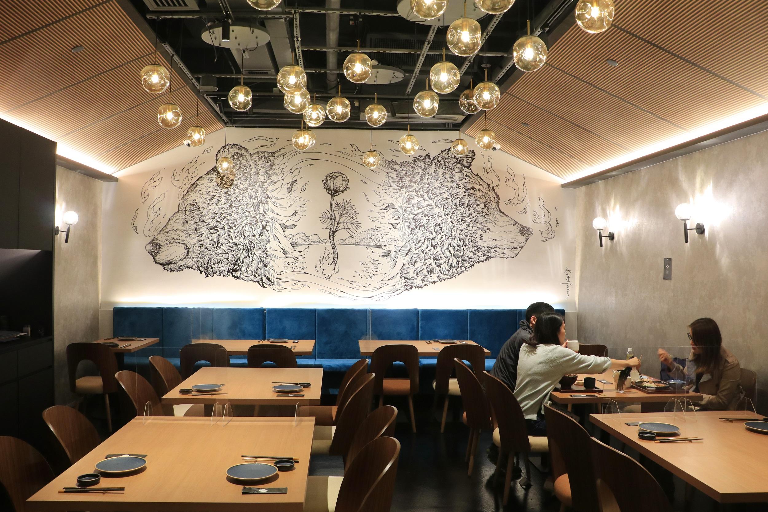 恍如穿越雪山洞入口,與應店名淳吟.峠(「峠」有山峰之意)相呼應,牆上手繪北海道原住民阿伊努族靈熊。熊從前被阿伊努族人視為神明,但同時亦有「祭熊」儀式。