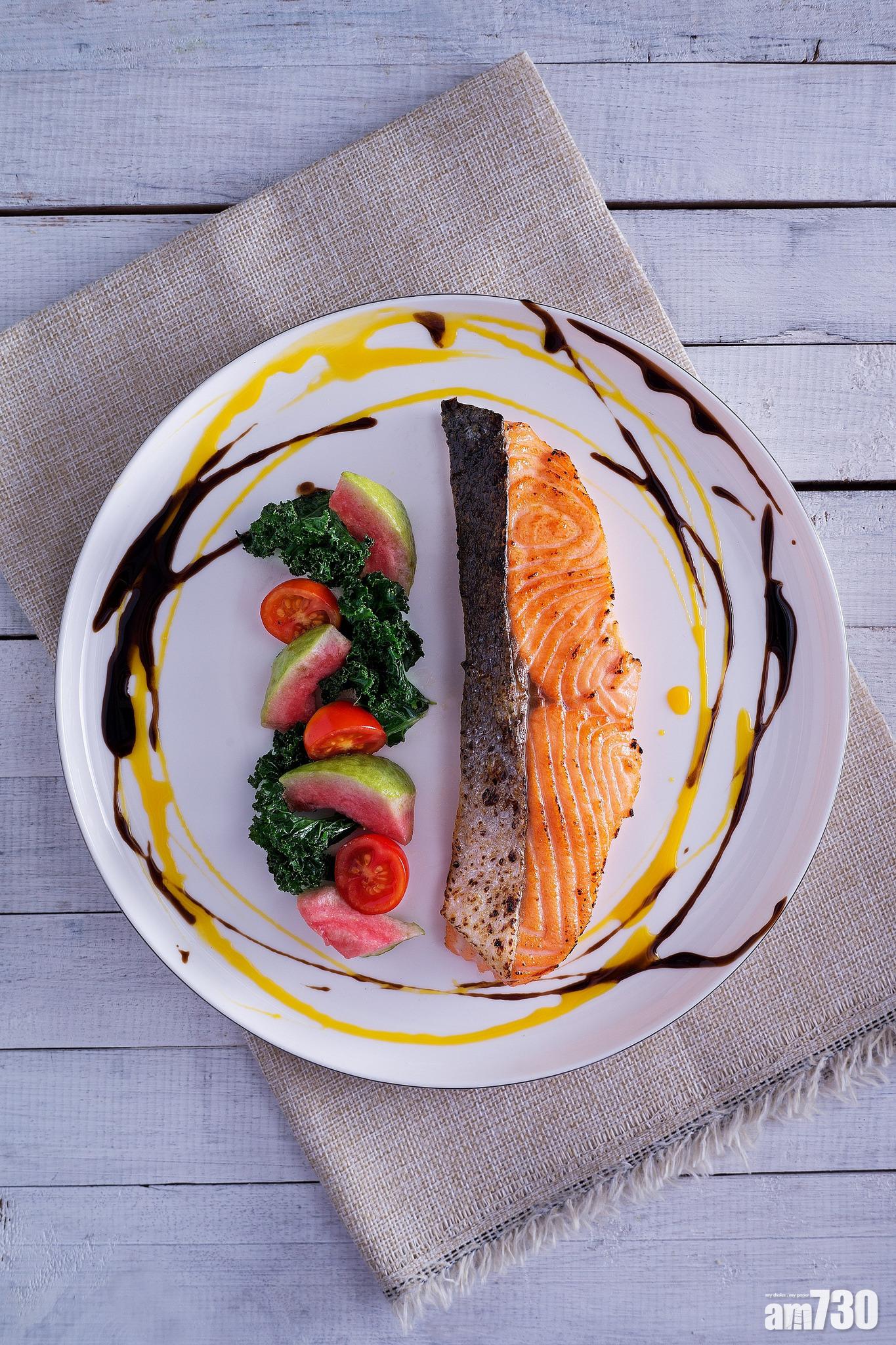 慢煮三文魚配法式雜菜沙律,魚肉鮮嫩多汁,配合新鮮蔬菜。