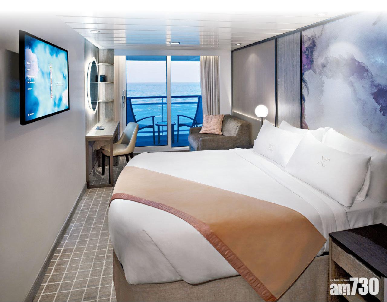 全新Celebrity EDGE排水量達129,500噸,載客達2,908人,設計師之一的Kelly Hoppen, MBE成功打造所有客房,甚至員工休息間恍如舒適的家一樣愜意。菁英遊輪香港代表總經理林樹德(圓圖)讚揚,Kelly擺脫郵輪的固有設計,運用個人室內設計經驗,把無際海景露台房的設計融合了艙房的室內和露台的室外空間,使露台隨時成為室內空間的一部分,從而增加了約23%的艙房面積,而且所有床上用品均為全純羊絨,提供最舒適的睡眠體驗。「Edge絕對稱得上一艘Deluxe and Premium(豪華和優質)的大型郵輪。」