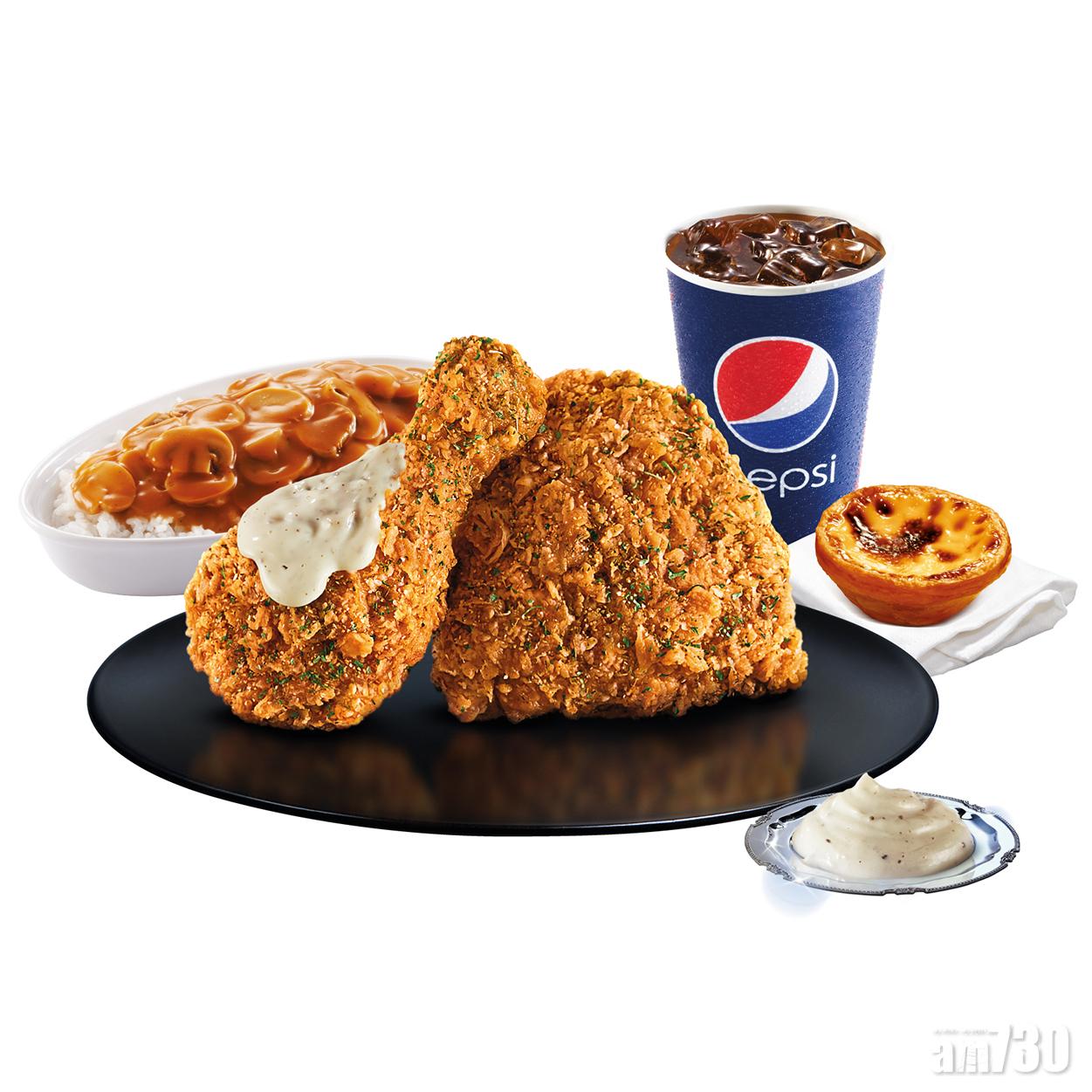 A2套餐,2件黑鑽松露點脆雞 (配黑鑽松露醬1包) + 辣汁蘑菇香飯(大) + 經典葡撻 + 汽水(中)/$46.5起
