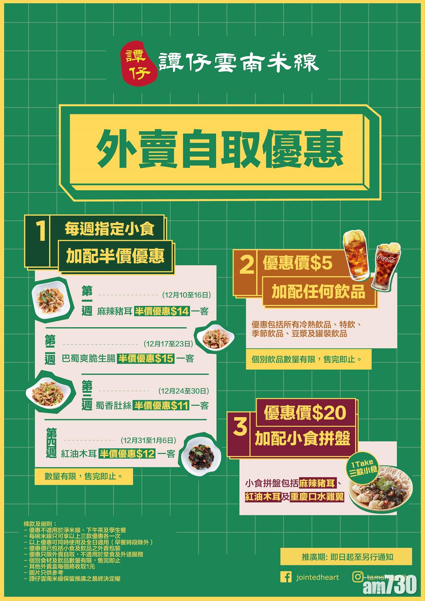 面對第四波疫情來勢洶洶,譚仔雲南米線全線分店繼續推出外賣自取期間限定優惠,讓大家可以把譚仔美食帶回家安心享用。由2020年12月10日起,凡惠顧任何米線(淨米線除外),均可以優惠價$5加配任何飲品和以$20加配小食拼盤,而每星期亦有指定小食加配半價優惠,以上優惠更可以同時使用,一次享盡三款優惠!