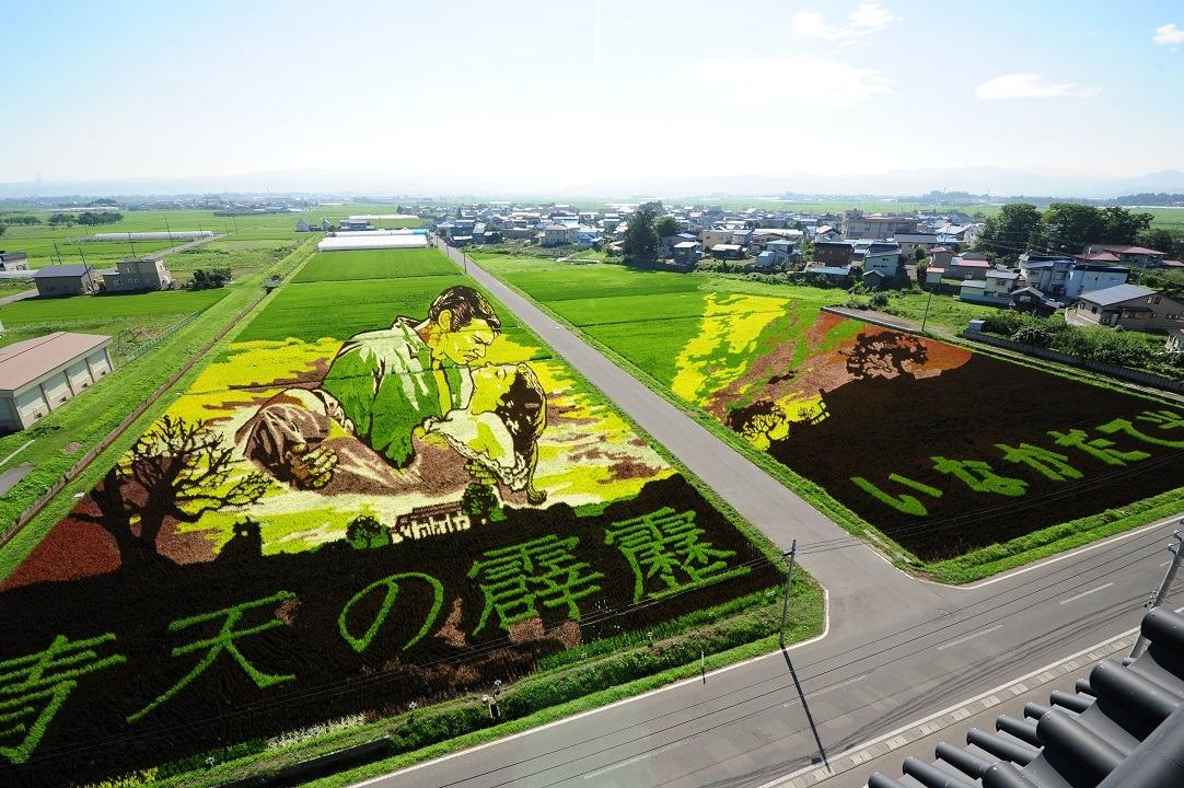 田舍館村的稻田藝術展現農業與創意的交融,自1993年起以彩色稻米繪製巨型畫作,技術精進至今可使用七色稻米創作。今年主題為「田舍館村70年的奇蹟」及以青森縣和岩手縣作背景的電影「美味的校餐」,7月中旬至8月中旬從展望台欣賞為最佳觀賞位置,畫作會隨稻米成熟而變化,呈現每日不同的風貌。