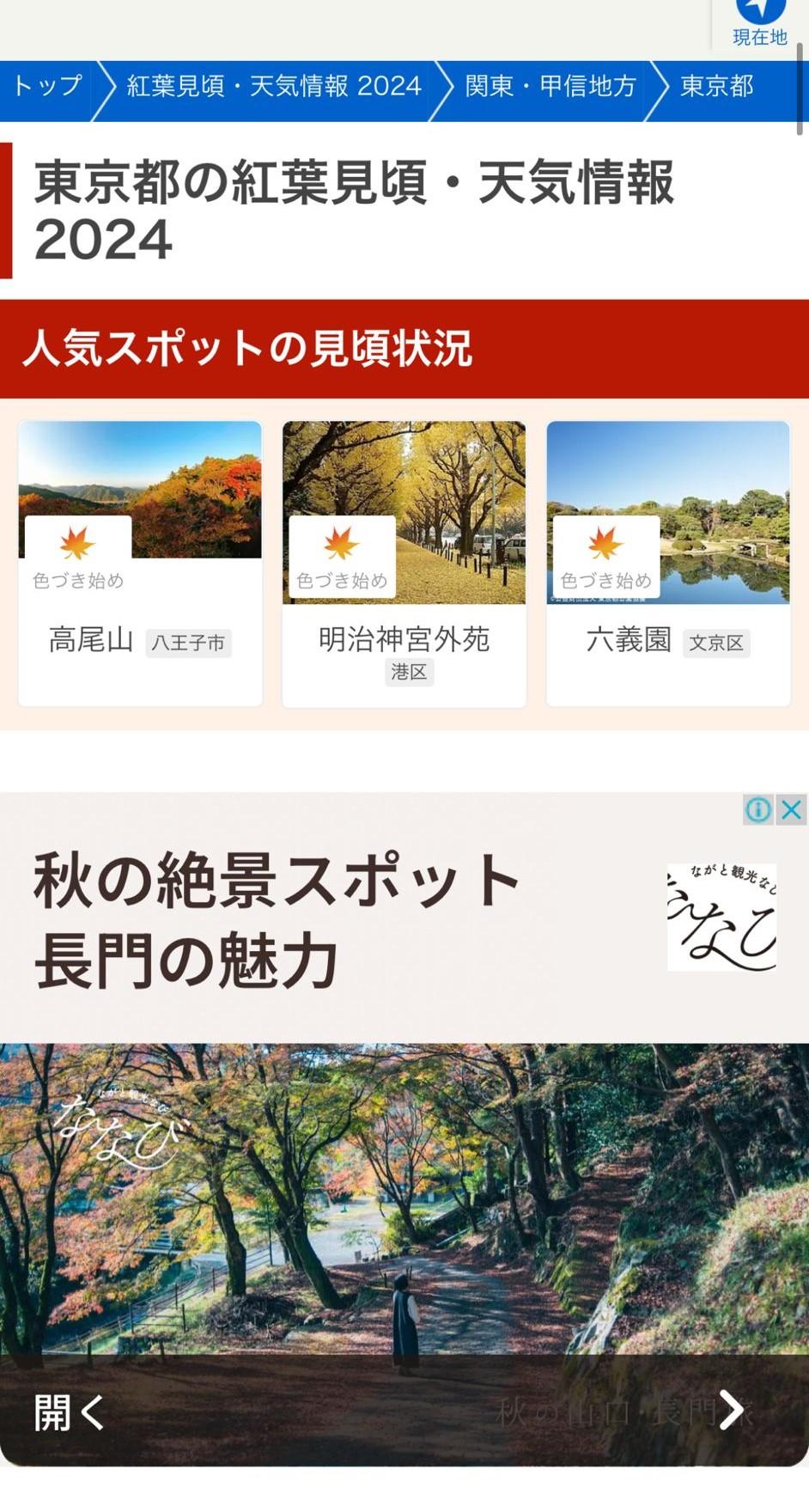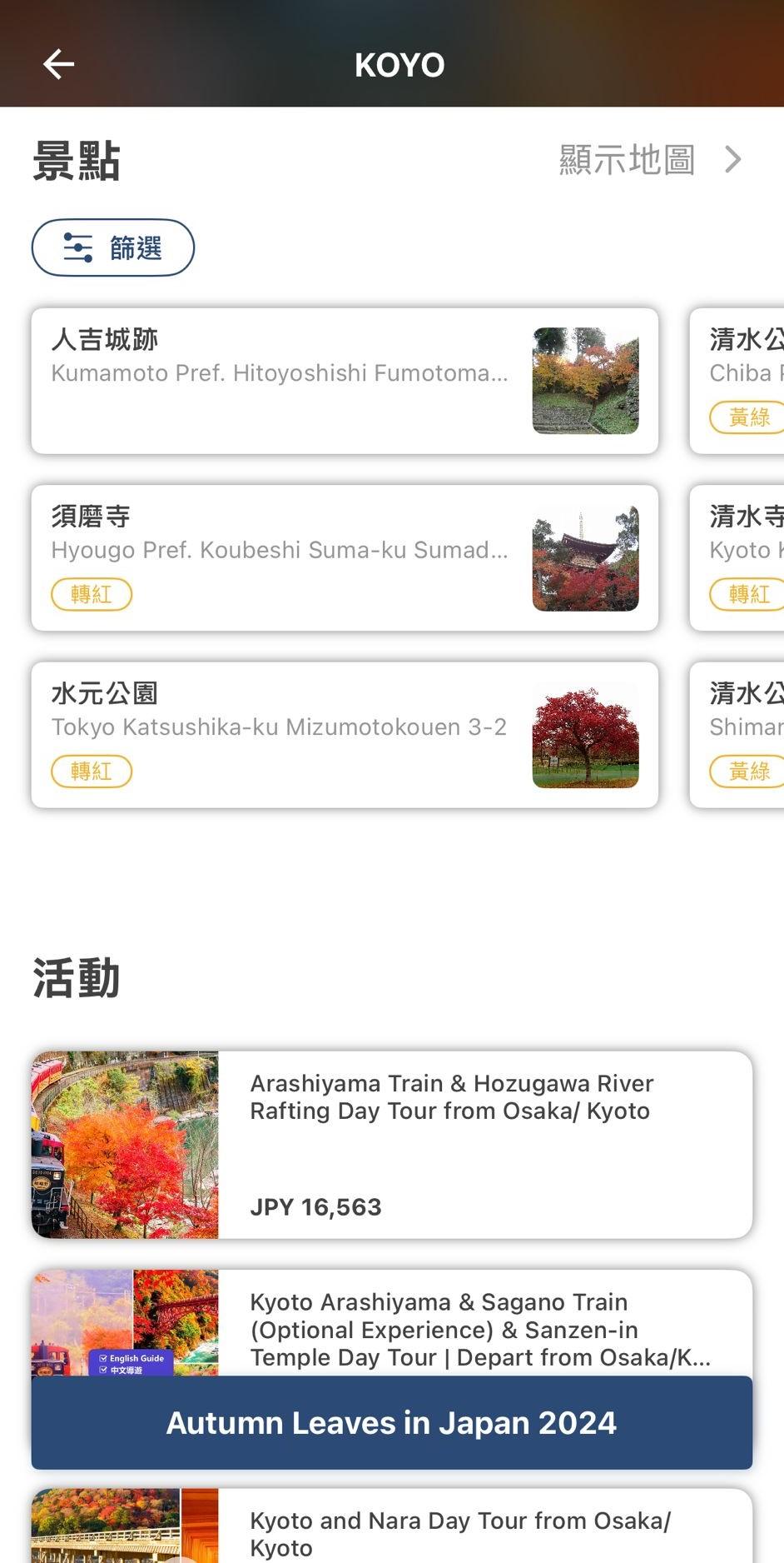如果想了解日本各地的楓葉情況,可使用「紅葉マップ」手機APP。界面操作簡單,可直接選擇日本不同區域查看,發堀最地道的賞楓景點,安排行程時必用!