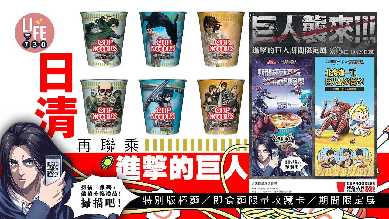 日清食品與人氣動畫《進擊的巨人》的聯乘活動再下一城,繼早前推出電視廣告,將於下月推出聯乘特別版包裝,一眾巨人及人氣角色更會於9月9日至10月20日期間「進擊」合味道紀念館香港,場內設有多個限定打卡熱點,為一眾動漫迷帶來打卡熱點。