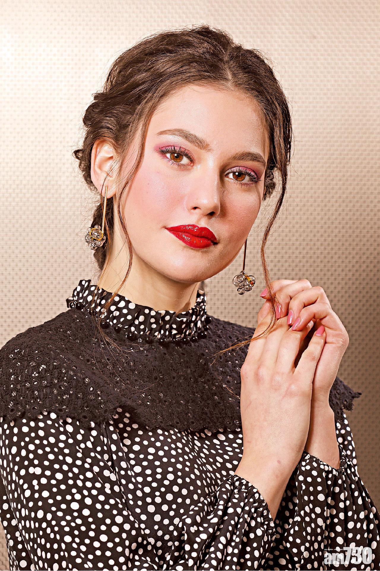 【魅惑黃昏的秘密】 黑白波點拼喱士上衣 $1,650 (d); 黑玻璃玫瑰花耳環 $480 (d)