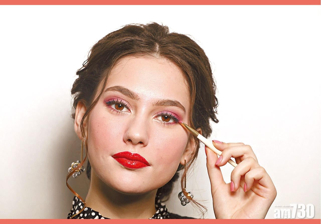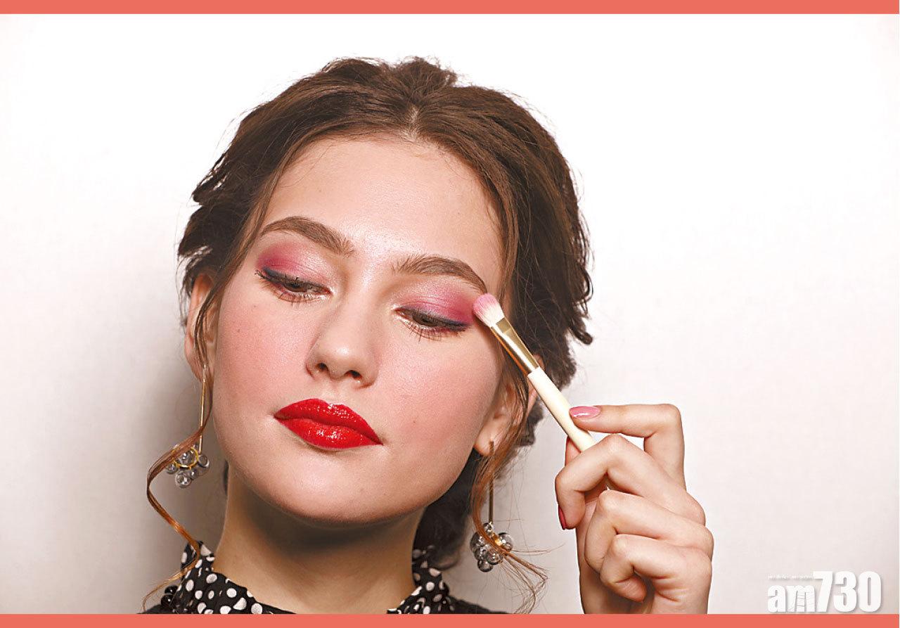Step 1 以酒紅及玫瑰粉紅眼影,塑造悅目的酒紅色煙燻眼妝,效果比黑或啡調的煙燻來得更有女人味;