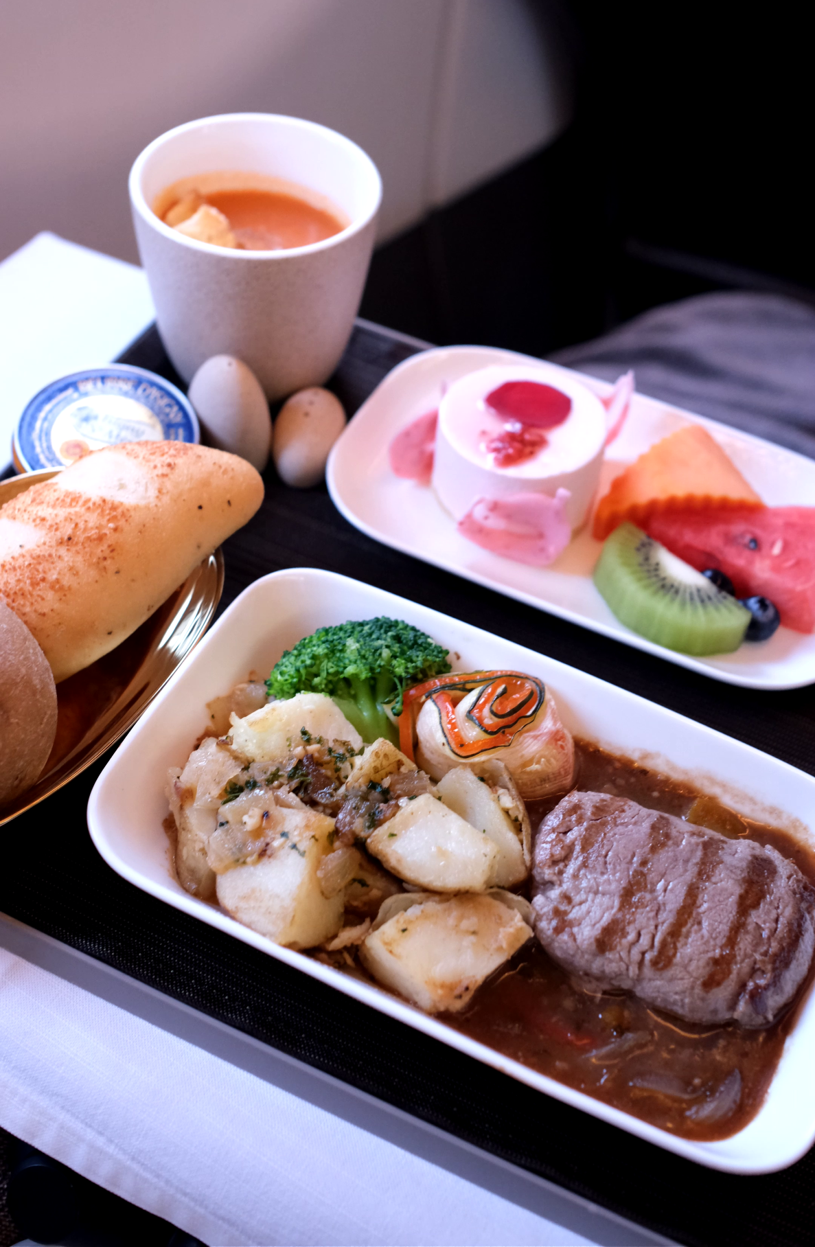 商務艙的餐飲誠意十足,與米芝蓮餐廳、知名餐飲品牌「胡同燒肉」合作,揉合各地飲食文化,在空中提供星級餐飲服務。最吸引的是與米芝蓮星級主廚林明建合作設計獨家菜單,以「從產地到天空 From Farm to Sky」為靈感,嚴選時令今材,讓大家品嘗亞洲創意佳餚。餐酒方面,除了使用英國皇室指定釀酒品牌BOLLINGER外,必試由台灣指標性的台南酒吧Bar TCRC及Bar Home主理人黃奕翔打造的調酒系列「星空特調」,當中的「湛藍宇宙2.0」更是網紅上機必點的打卡餐飲!
