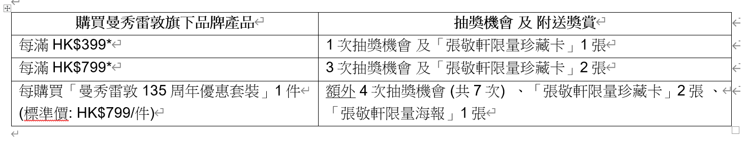 另凡購買「曼秀雷敦135周年優惠套裝」1件,即可獲額外4次抽獎機會及「張敬軒限量海報」1張,抽獎機會不設上限,每位得獎者可得「曼秀雷敦135周年 X 張敬軒 LOVE! CARE! MEET! 千人聚會」門票1張 (名額1000個)。珍藏卡及海報數量有限,送完即止。