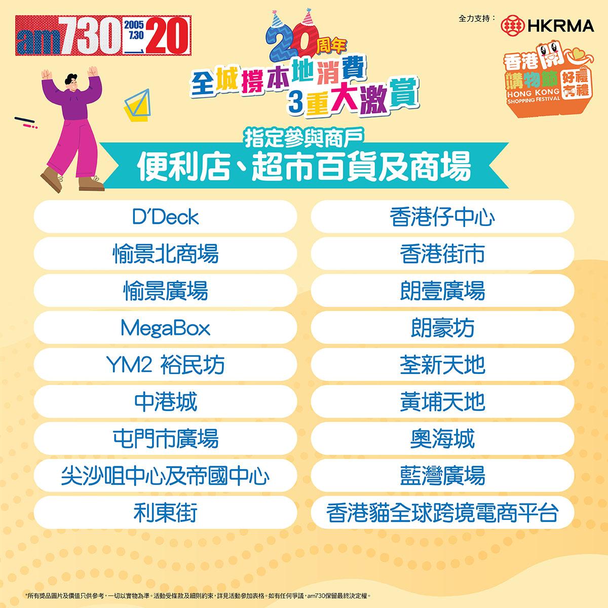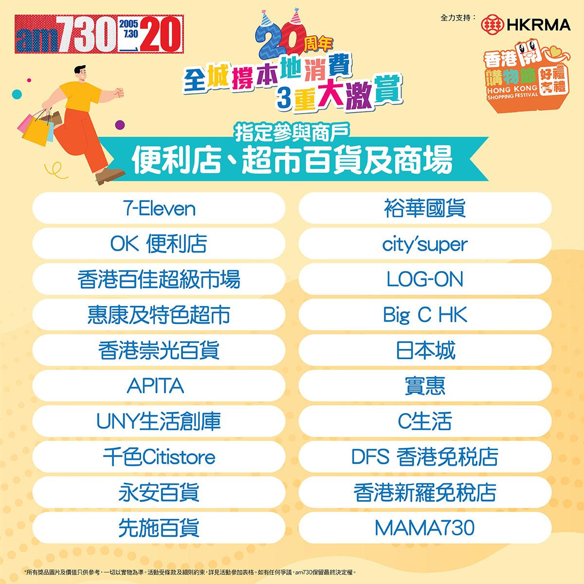 am730》昂然踏入20周年!慶祝活動一浪接一浪!202571日至831日期間將舉行「全城撐本地消費3重大激賞」!凡於指定參與商戶以電子貨幣單一消費滿HK$20^,經 am730 手機應用程式上載合資格的#機印發票及相符的電子貨幣付款存根,並回答簡單問題參加,即有機會獲得每輪消費賞豐富獎品!每人每日均可登記1次!每輪消費賞首500位登記合資格發票之會員更可獲得參加賞!趁住香港零售管理協會於7至8月期間舉行「香港開心購物節2025」有咁多優惠,一於密密消費日日登記,累積最高消費金額贏走終極大獎!