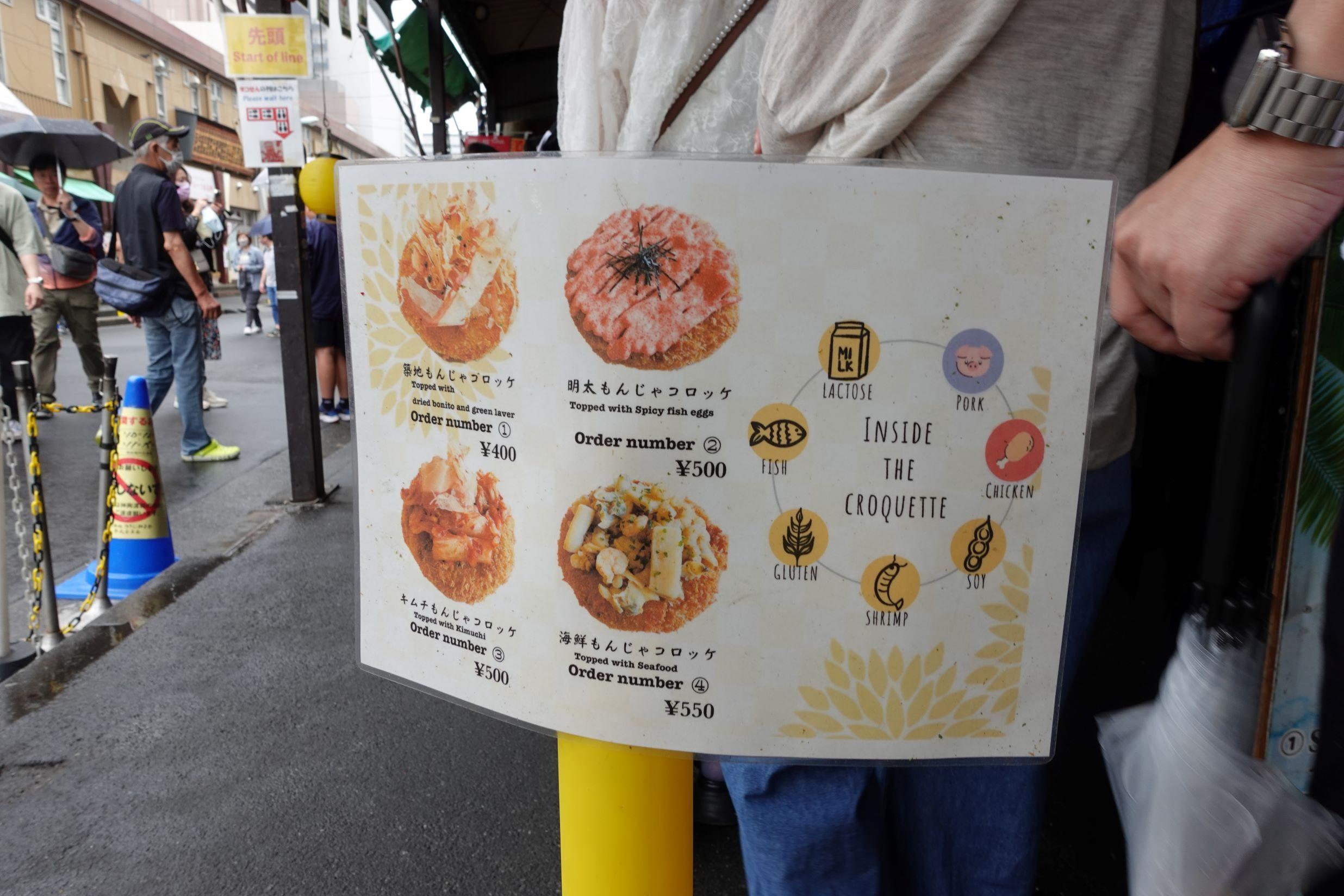 「築地コロッケ」是去年才新開業的人氣小店,專賣非常少見的吉列文字燒,吸引不少本地人前往光顧。店家將傳統鐵板文字燒搖身一變製成香口炸物,外皮香脆,內裡的文字燒黏口熱辣,另外再配上明太子醬和木魚碎,整體層次豐富!