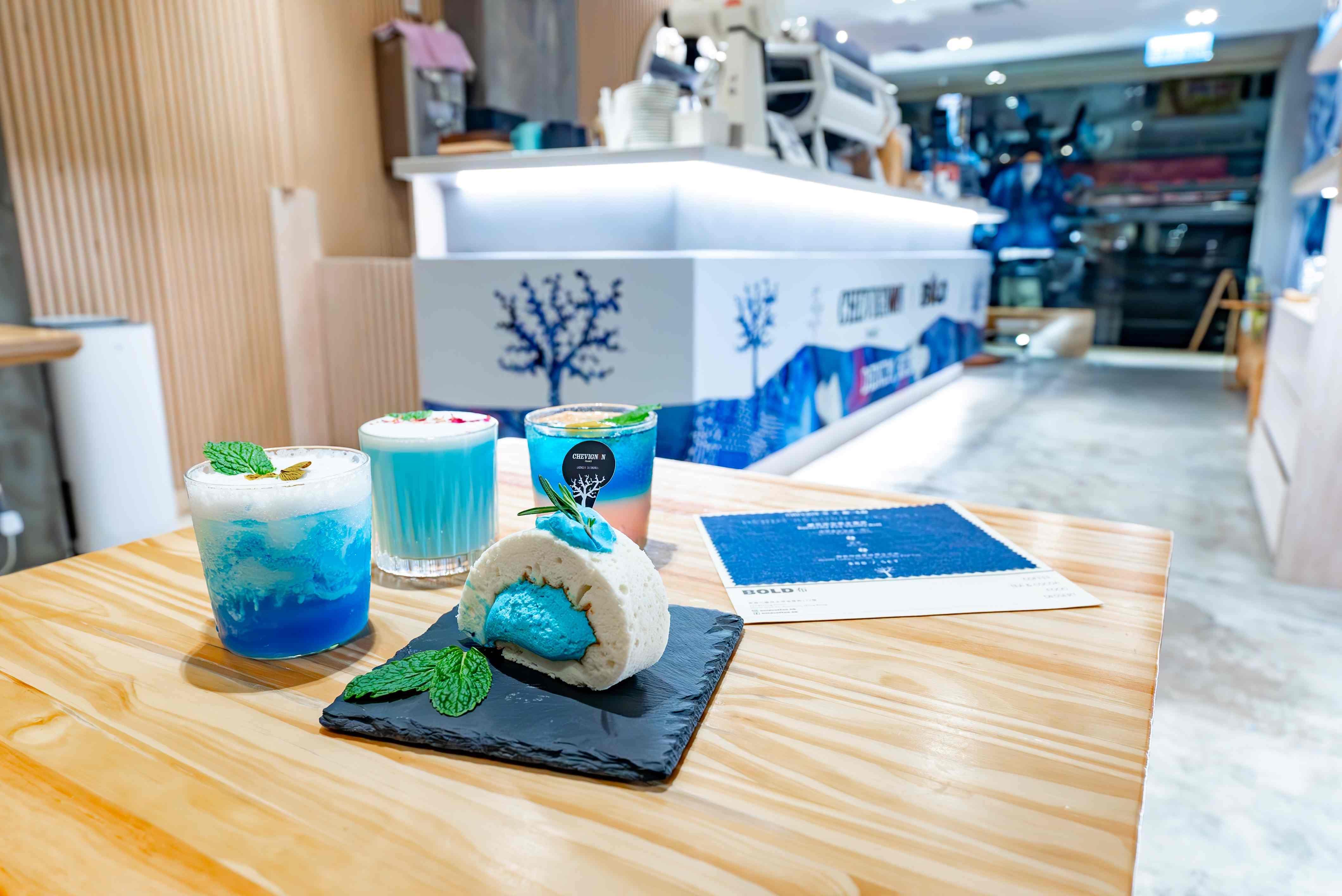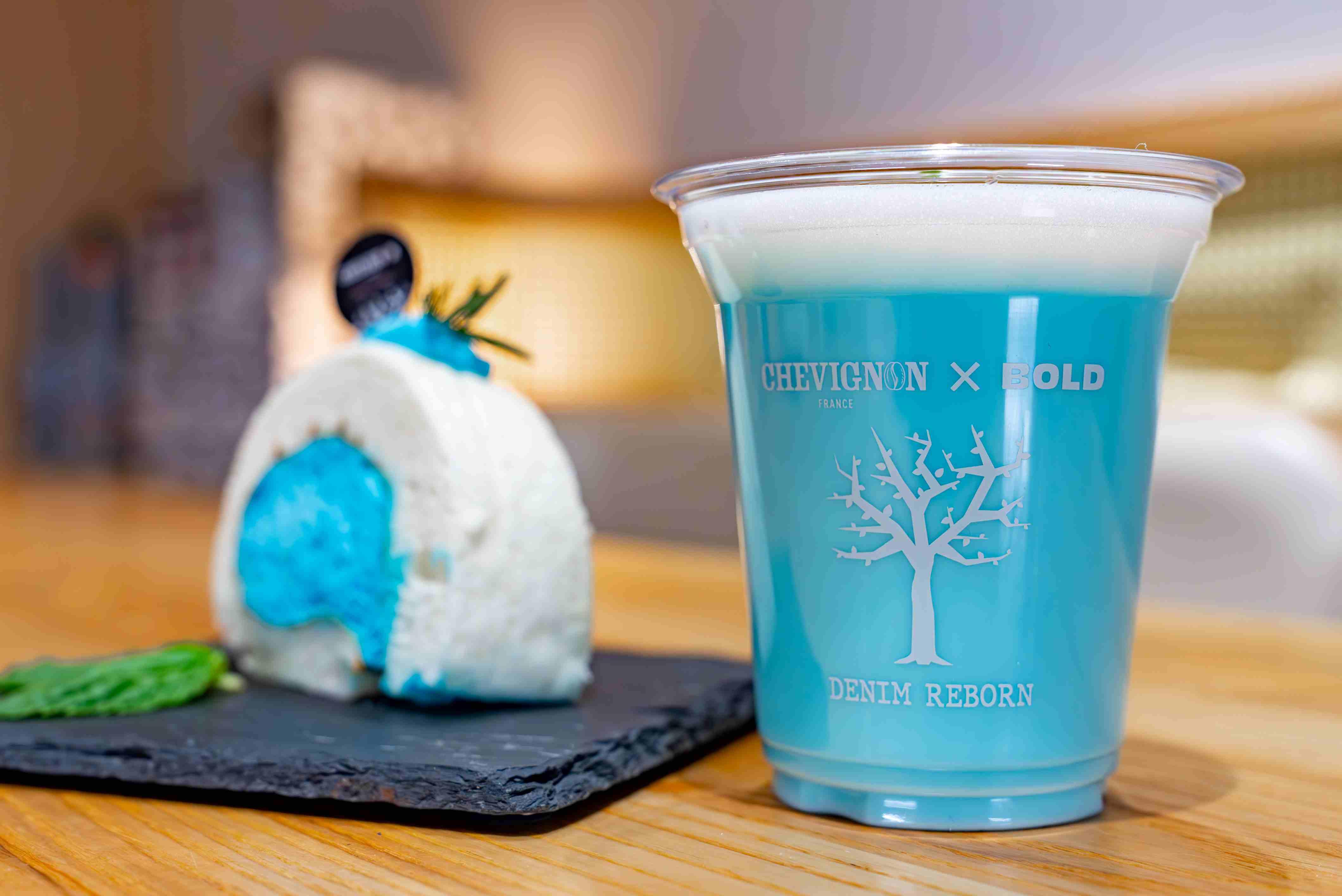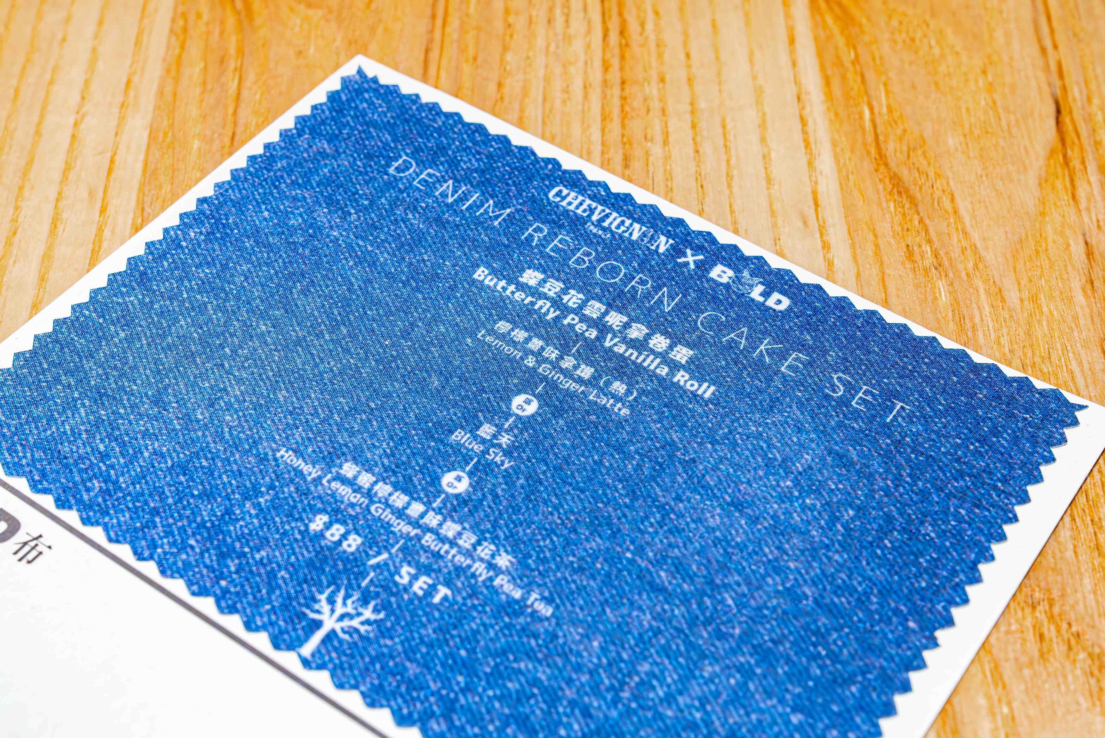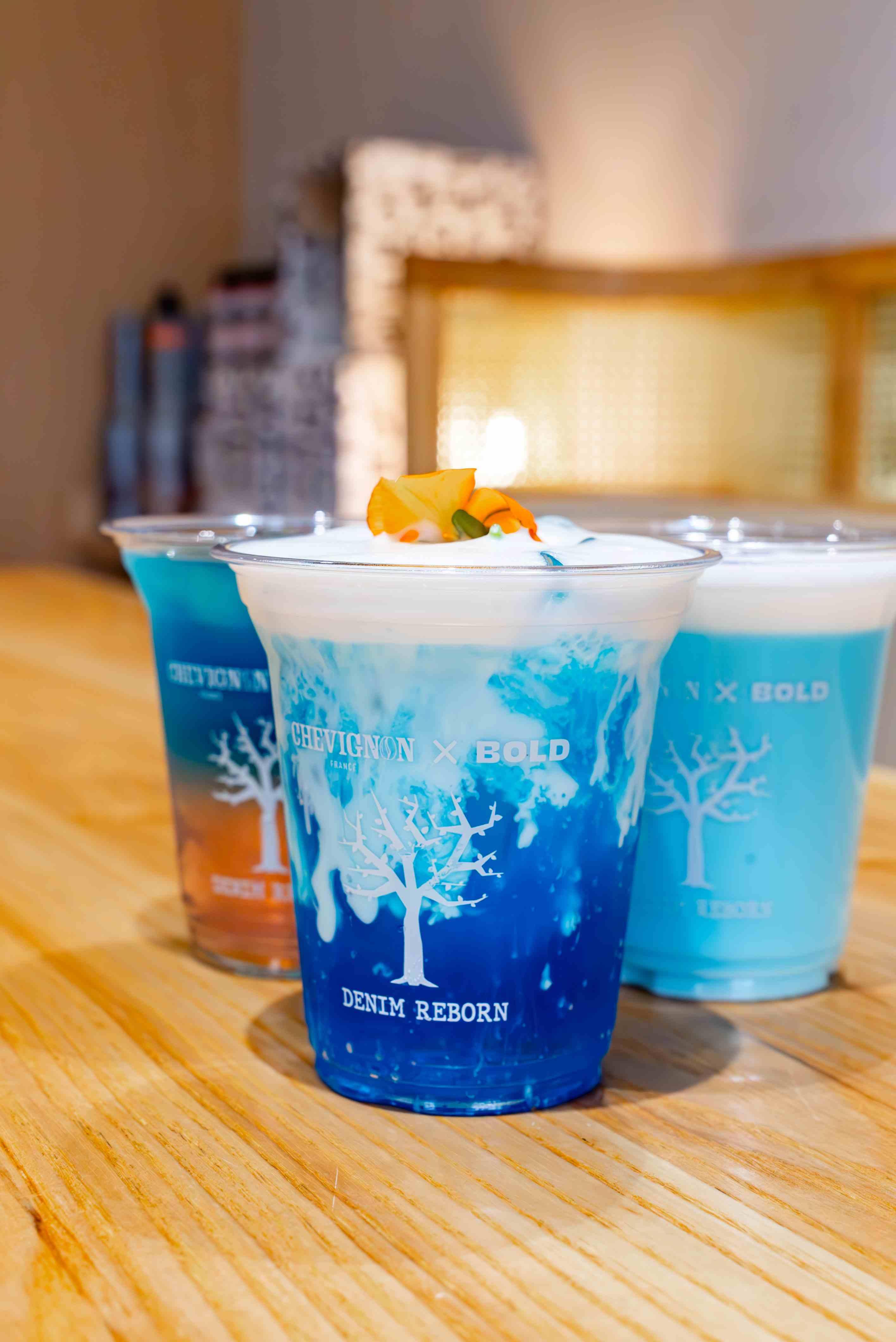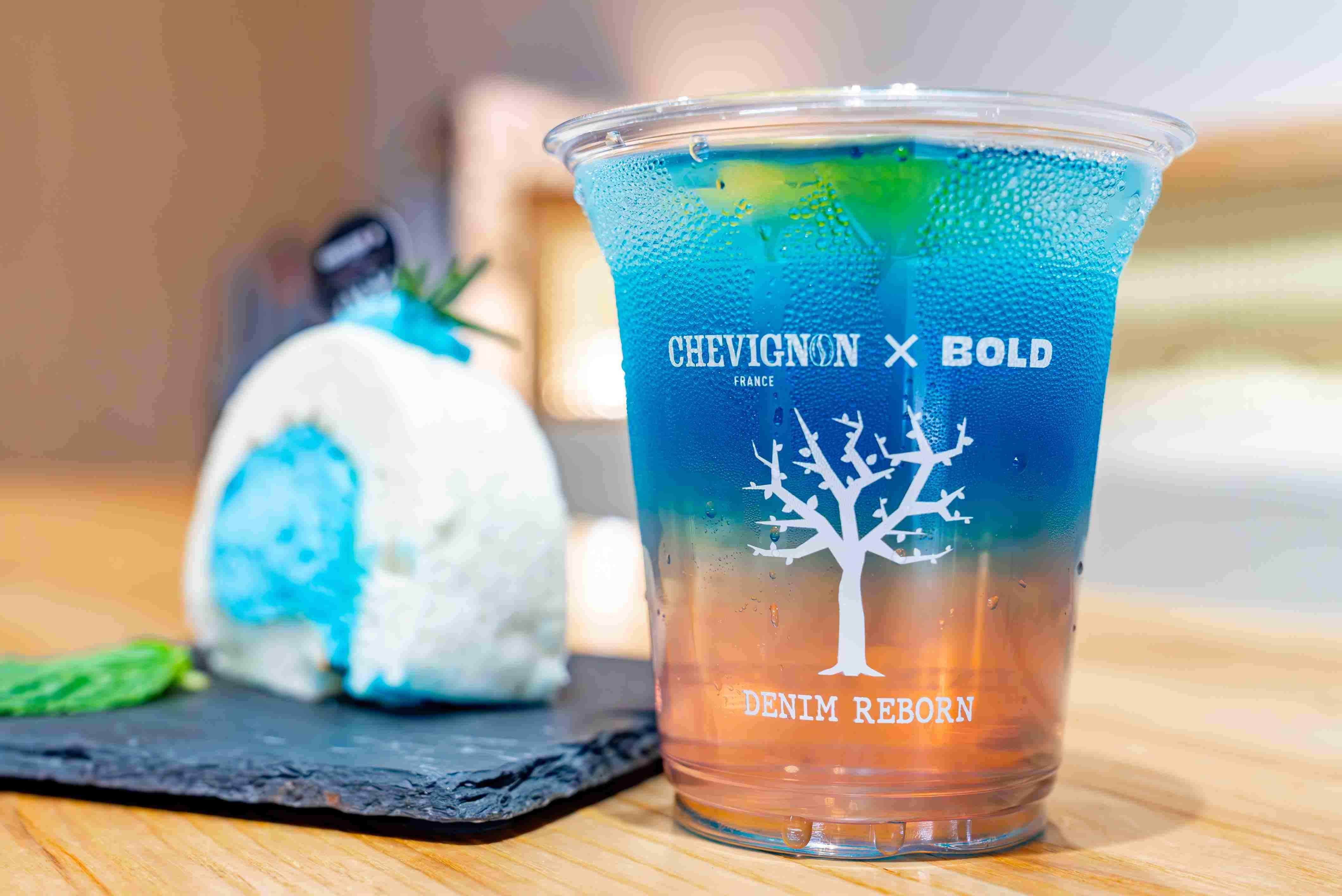 Chevignon 與 BOLD COFFEE 聯手推出期間限定菜單Denim Reborn Cake Set,以牛仔藍為主色,飲品配襯綠葉作為裝飾,呼應是次「Denim Reborn」 聯乘系列。當中包括蝶豆花雲呢拿卷蛋、及檸檬薑味拿鐵(熱);或 藍天(凍);或 蜂蜜檸檬薑味蝶豆花茶(凍)。