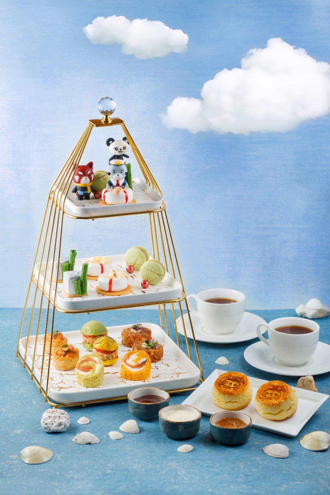 法式糕點及甜點:「威威」黑芝麻紅豆慕絲蛋糕、「包包」特濃雙層黑白朱古力蛋糕、「小紅熊」開心果馬卡龍、精選牛油鬆餅配英式奶油忌廉、玫瑰士多啤醬、茉莉柚子果醬