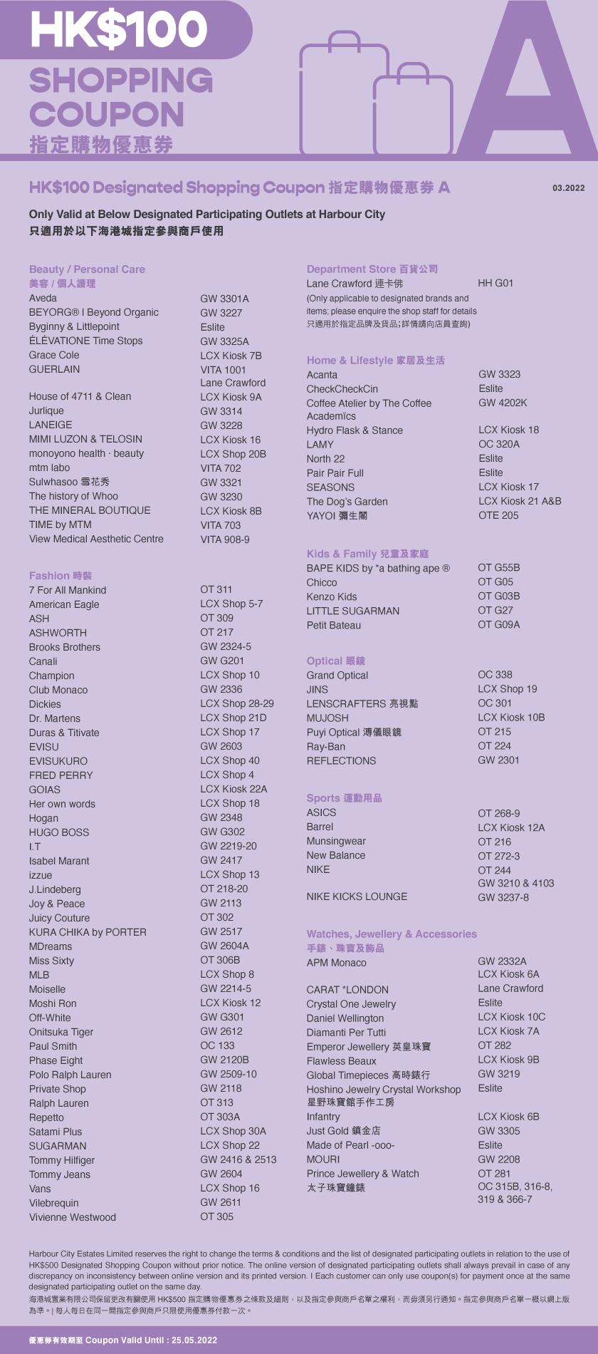 海港城另有「REWARDING EVERY DAY優惠券獎賞」,由即日至5月15日,顧客於同日以指定電子付款方式消費每滿$1,500即可獲「$100購物優惠券」、「$50美食優惠券」及「$100美食優惠券」各1張;消費每滿$4,000更可額外獲贈「$500購物優惠券」1張。逢周二及周日更可獲雙倍優惠券獎賞,最多可賺取$15,000優惠券。