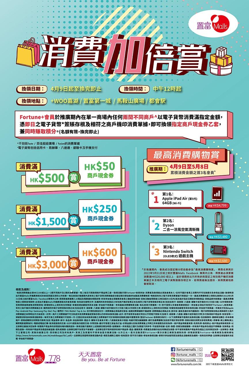 置富Malls同時推出「最高消費購物賞」,Fortune+會員於推廣期內,在指定4大商場包括+WOO嘉湖、馬鞍山廣場、置富第一城、都會駅以電子消費並上載有效的消費單據,即自動參加「最高消費購物賞」,推廣期內累積最高消費金額之3名會員可獲贈總值超過$10,000的新款智慧家電或電子遊戲產品,如Apple iPad Air (第5代) 64GB(Wi-fi)、Dyson 2合1涼風空氣清新機或NINTENDO Switch (OLED款式)遊戲主機。