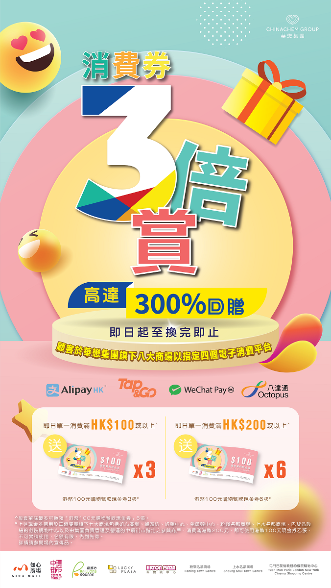 由政府發放消費券當日起,凡於7大商場及中環街市,以4款指定儲值支付工具(支付寶香港、八達通、Tap&Go 「拍住賞」及 WeChat Pay 香港)消費滿$100,即可獲贈一套3張$100元現金券,合共價值$300,盡享高達300%回贈優惠。每張收據最多可換領兩套現金券,換完即止。