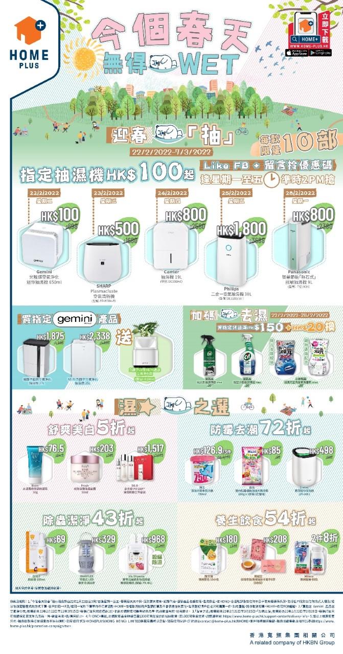 另外,呢排成日落雨濕笠笠,網購平台HOME+由即日起至2022年3月15日,HOME+舉行「今個春天無得 Wet」(home-plus.hk/tc_hk/spring2022),精選一連串抽濕用品以驚喜價發售,包括獅王吸濕大笨象、白元強力抽濕器及雞仔牌迷你萬用抽濕袋等。