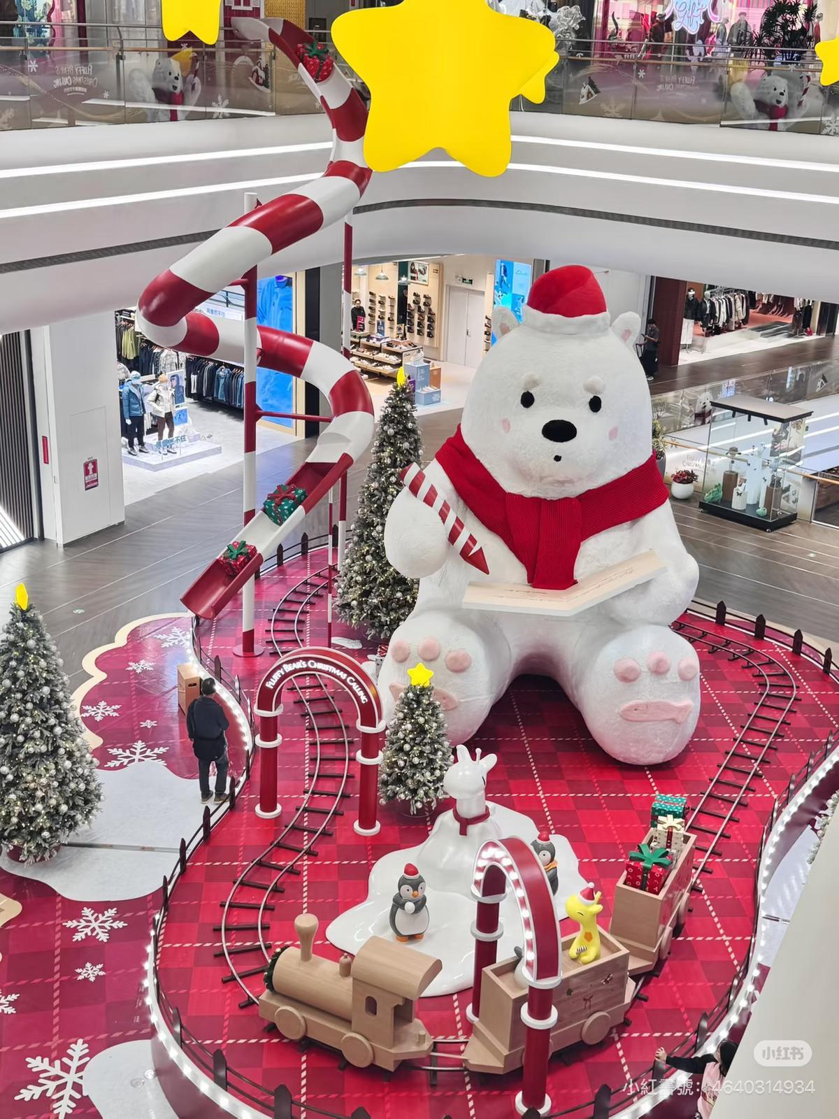 深業上城今個冬季變身「絨熊冬日」童話世界,場景由一樓至三樓遍佈多個造景。一樓中庭有巨型絨絨熊、小木屋、聖誕樹與復古小火車;東門位置則放有乘雪橇的絨熊及大型水晶玻璃球,節日感十足。