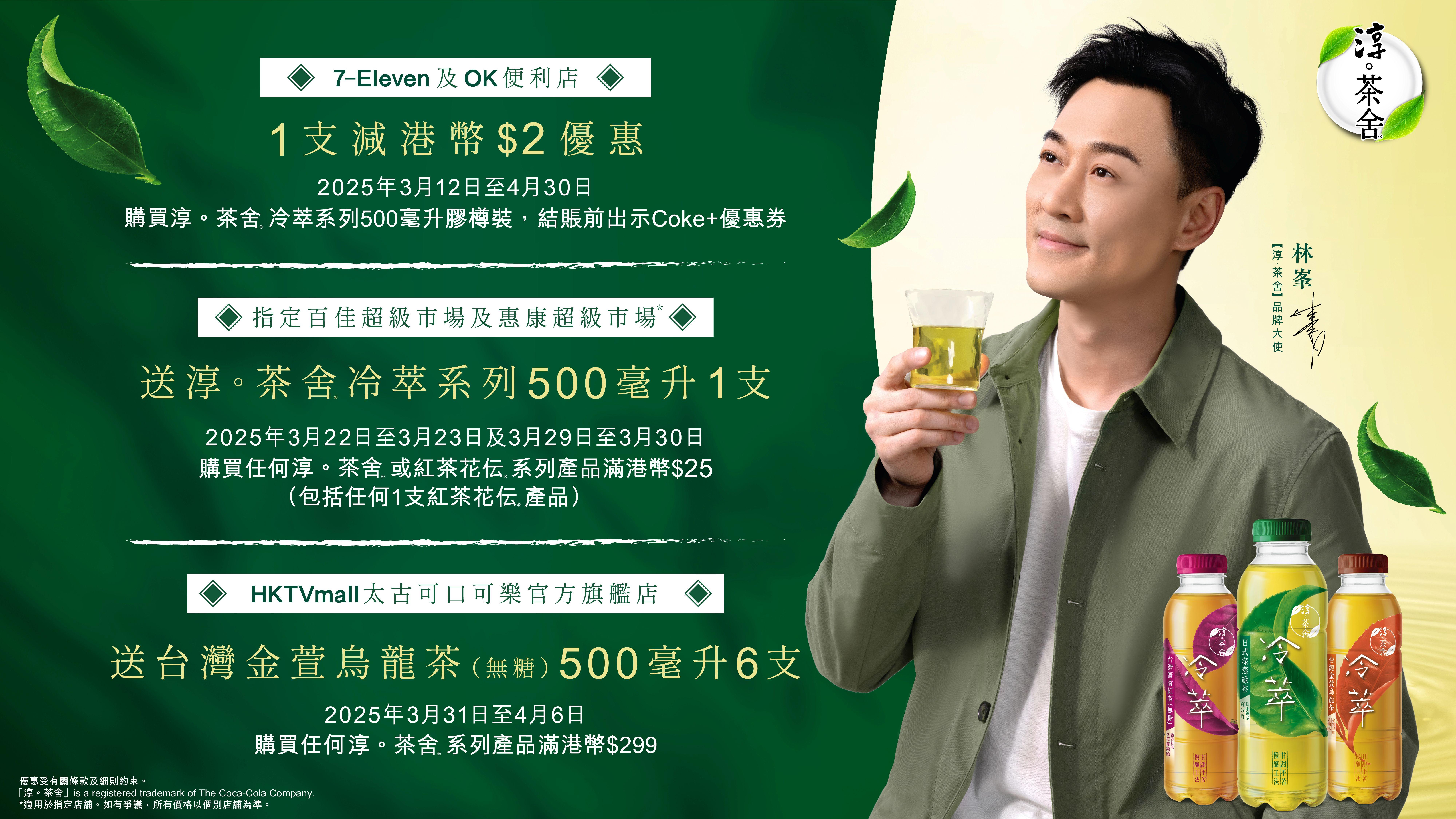 3⽉12⽇⾄4⽉30⽇期間,購買淳。茶舍冷萃系列500 毫升膠樽裝,使⽤Coke+ 優惠券即享減$2優惠。