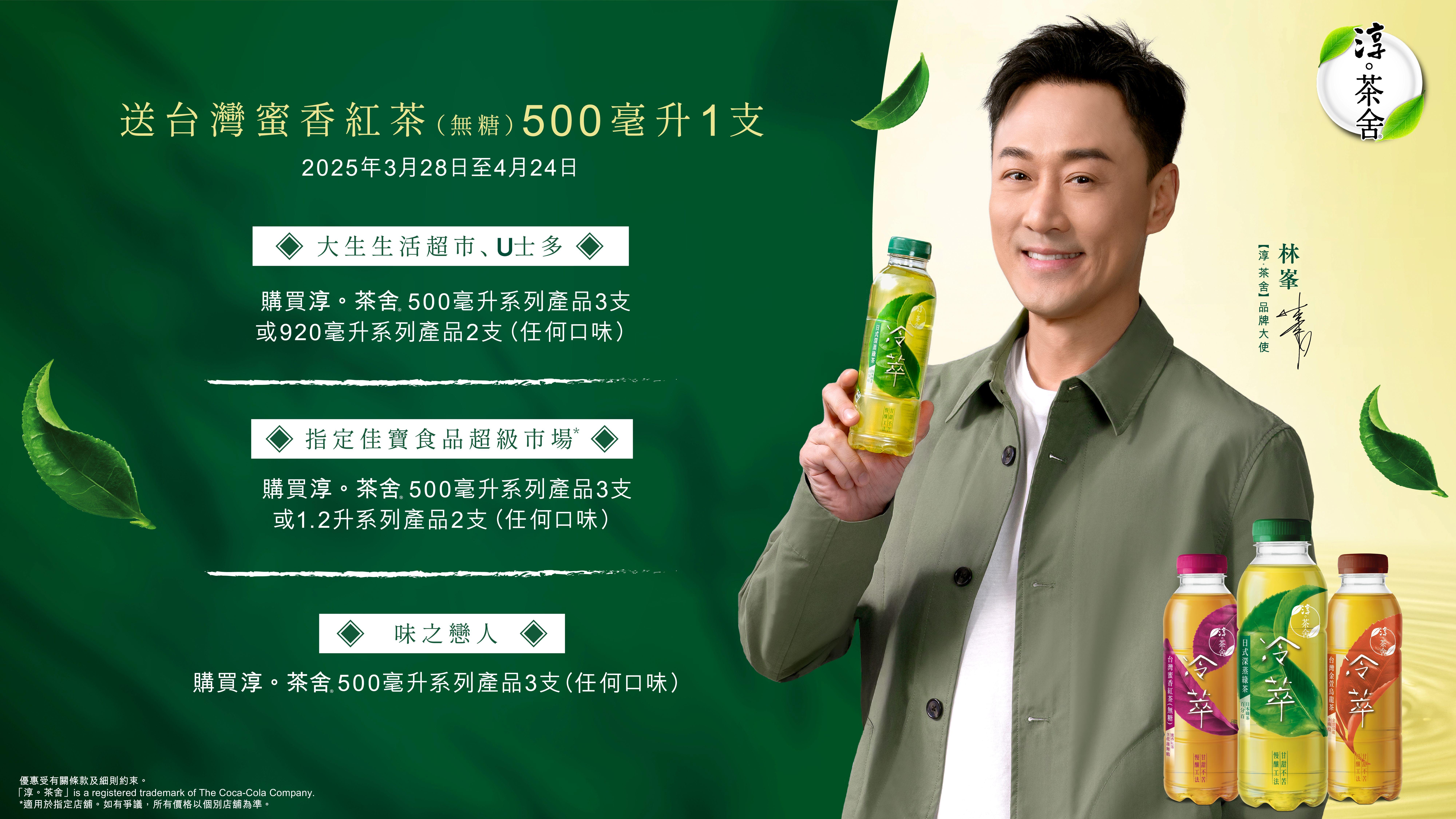 3⽉28⽇⾄4⽉24⽇期間,買淳。茶舍 500 毫升系列產品3 ⽀或920 毫升系列產品2 ⽀(任何⼝味),即送淳。茶舍冷萃台灣蜜香紅茶500 毫升1 ⽀。