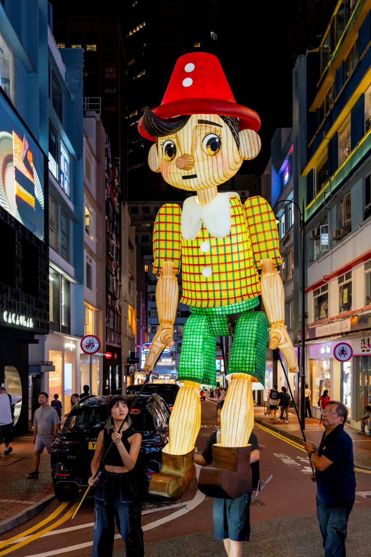 亮相的巨型木偶有《木偶奇遇記》故事中的皮諾丘、老木匠、狡猾狐狸、大鯨魚等。 巨型木偶及嘉年華服飾由13組香港藝術家精湛技法製造。 夜光巡遊將於11月29日晚上8時30分開始,從利園一期正門出發。
