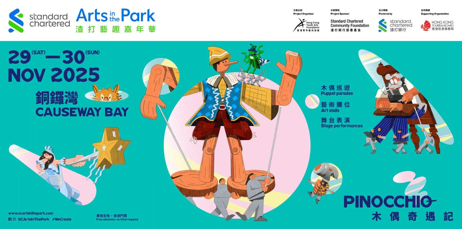 「渣打藝趣嘉年華」踏入25周年,闊別七年後,將於11月29及30日回歸銅鑼灣盛大舉行。今屆以意大利經典童話《木偶奇遇記》為主題,一連兩天都有免費精彩節目,包括重頭戲巨型木偶巡遊、璀璨奪目的夜光巡遊、17個互動藝術攤位、現場故事演講、非洲鼓樂坊、60個青少年藝術團隊無間斷的舞台表演,以及逾1,000件藝術作品展覽。