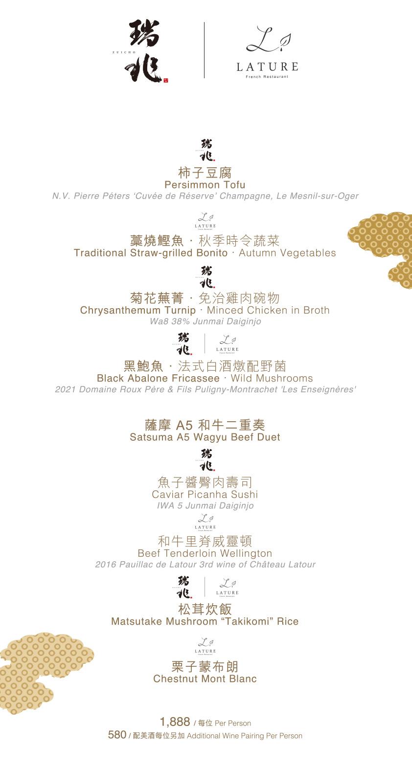 八道菜午餐(MOP$1,888)包括瑞兆全新菜式「菊花蕪菁免治雞肉碗物」、LATURE的考究菜色「藁燒鰹魚配秋季時令蔬菜」,以及兩位總廚合力烹調的「黑鮑魚配法式白酒燉配野菌」和「松茸炊飯」等。而十道菜晚宴(MOP$2,688)兩位總廚更精選豪華贅沢食材打造喉黑魚二食,分別是「喉黑魚蜆湯」和「海膽醬燒喉黑魚」,旬の食材鮮味入魂,進一步昇華「不時不食」的餐飲哲學。