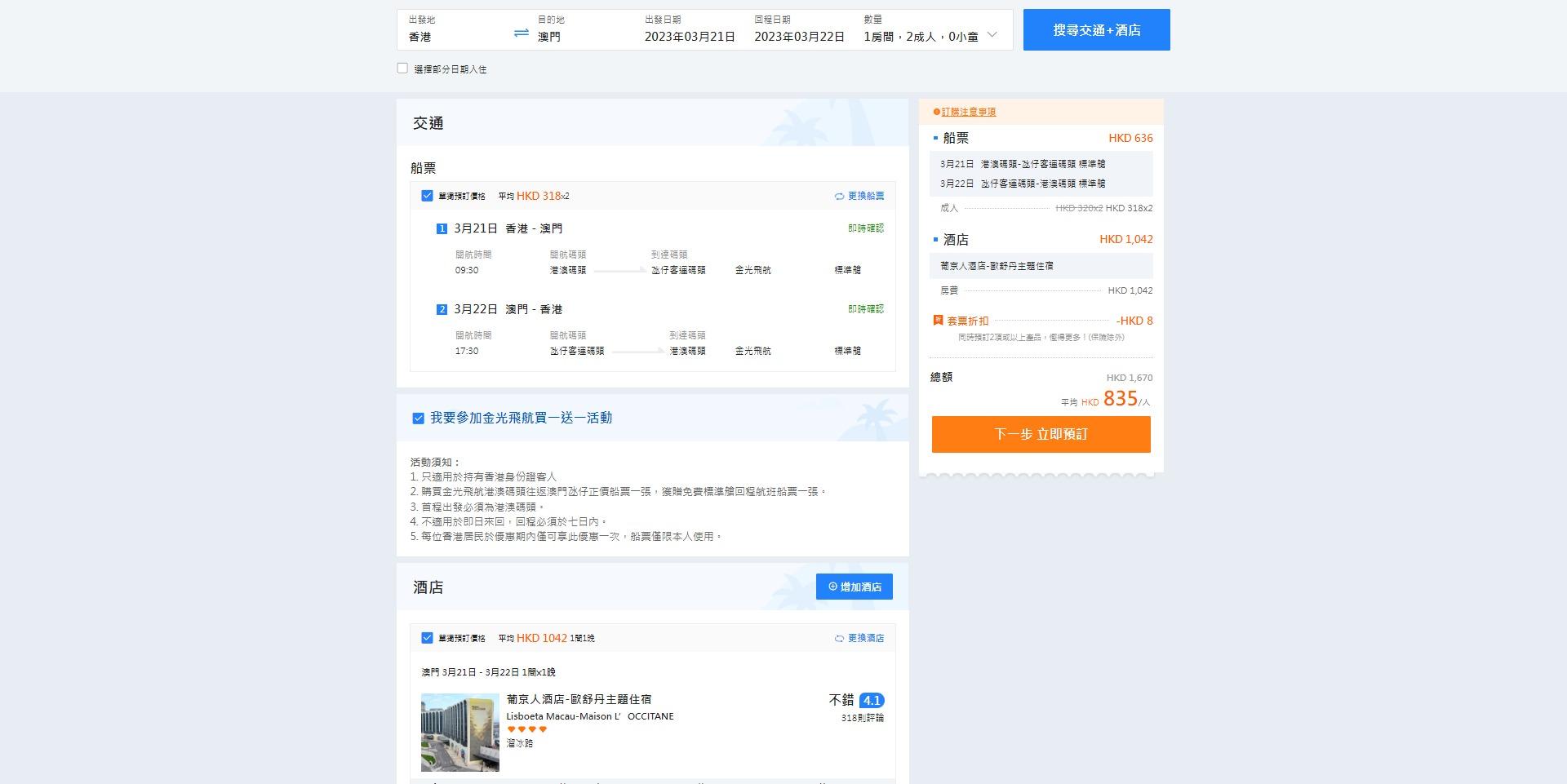 之後再加上香港居民專享的金光飛航船票買去程送回程優惠,雙人去程船票$318,所以入住葡京人主題住宿高級大床房連早餐及船票合並$1,319,計番人均只需$660;而歐舒丹主題住宿連船票則人均低至$676,不過就無包早餐,呢個價位肯定是近期最抵!不過要留意,每名香港居民只能用一次船票買一送一優惠,如果你早前已經用過這個優惠去澳門,今次就買不到這款套票了。