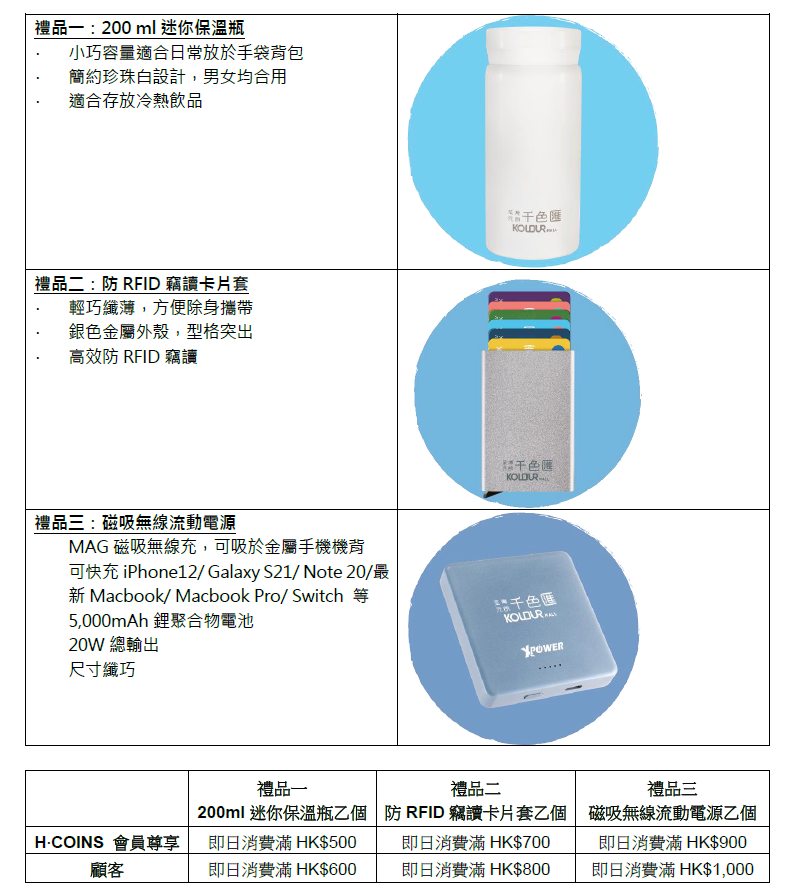 荃灣千色匯與元朗千色匯推出「嚐食常買禮品賞」優惠,以電子貨幣即日消費滿指定金額,即可換領各款型格購物禮遇,為父親送上既型格又好用的小物。由即日起至7月10日,於兩間商戶以電子貨幣即日消費滿以下指定金額,憑兩間不同商戶的即日電子機印發票 (每張發票必需消費滿$100或以上),連同相符的正本電子貨幣顧客付款存根,即可換領以下禮品一份。成為H‧COINS會員更尊享獨優惠換領價,以及可額外儲COINS。