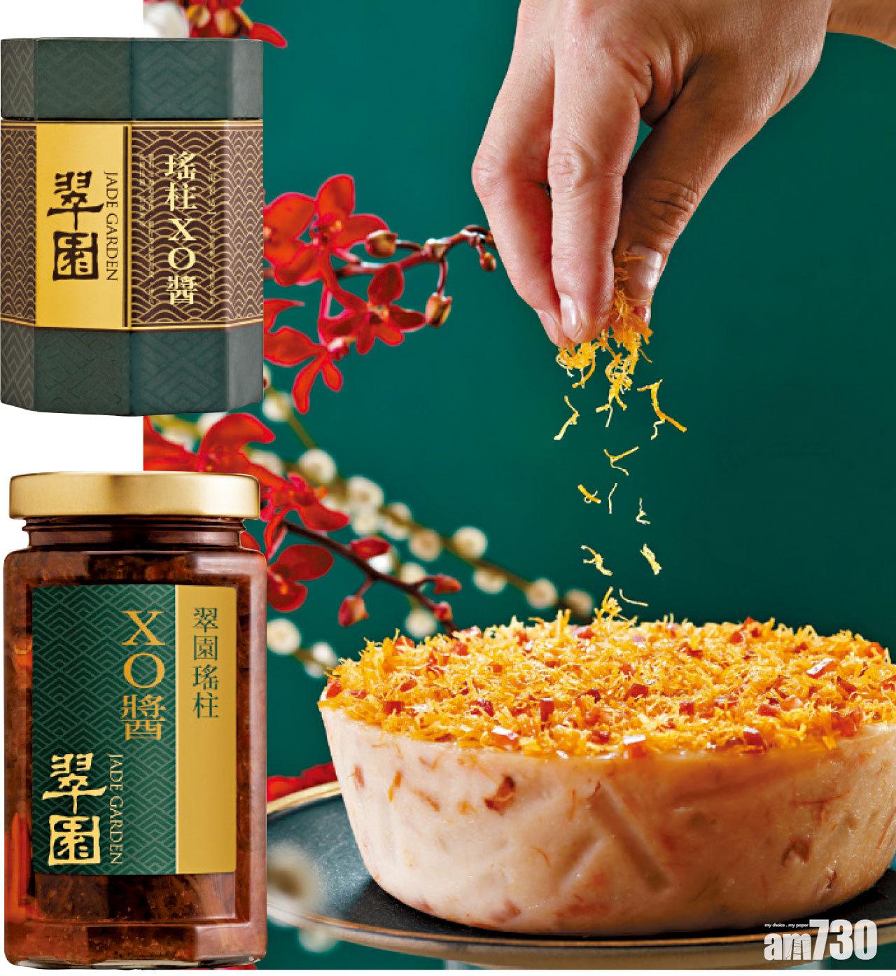 蘿蔔糕可以說是新年必食糕點。翠園金腿瑤柱蘿蔔糕百分百香港製造,師傅細心將蘿蔔切成粗條,令蒸煮時不致完全溶化,入口仍嚼到蘿蔔的清甜;加入醇香煙韌的金腿,還有鮮味的瑤柱、爆香的臘味和蝦米,啖啖足料,濃香味美。進食時搭配嚴選北海道瑤柱、金華火腿、優質蝦籽、蝦米、原隻辣椒等頂級材料製成的瑤柱XO醬,口感更上一層樓。