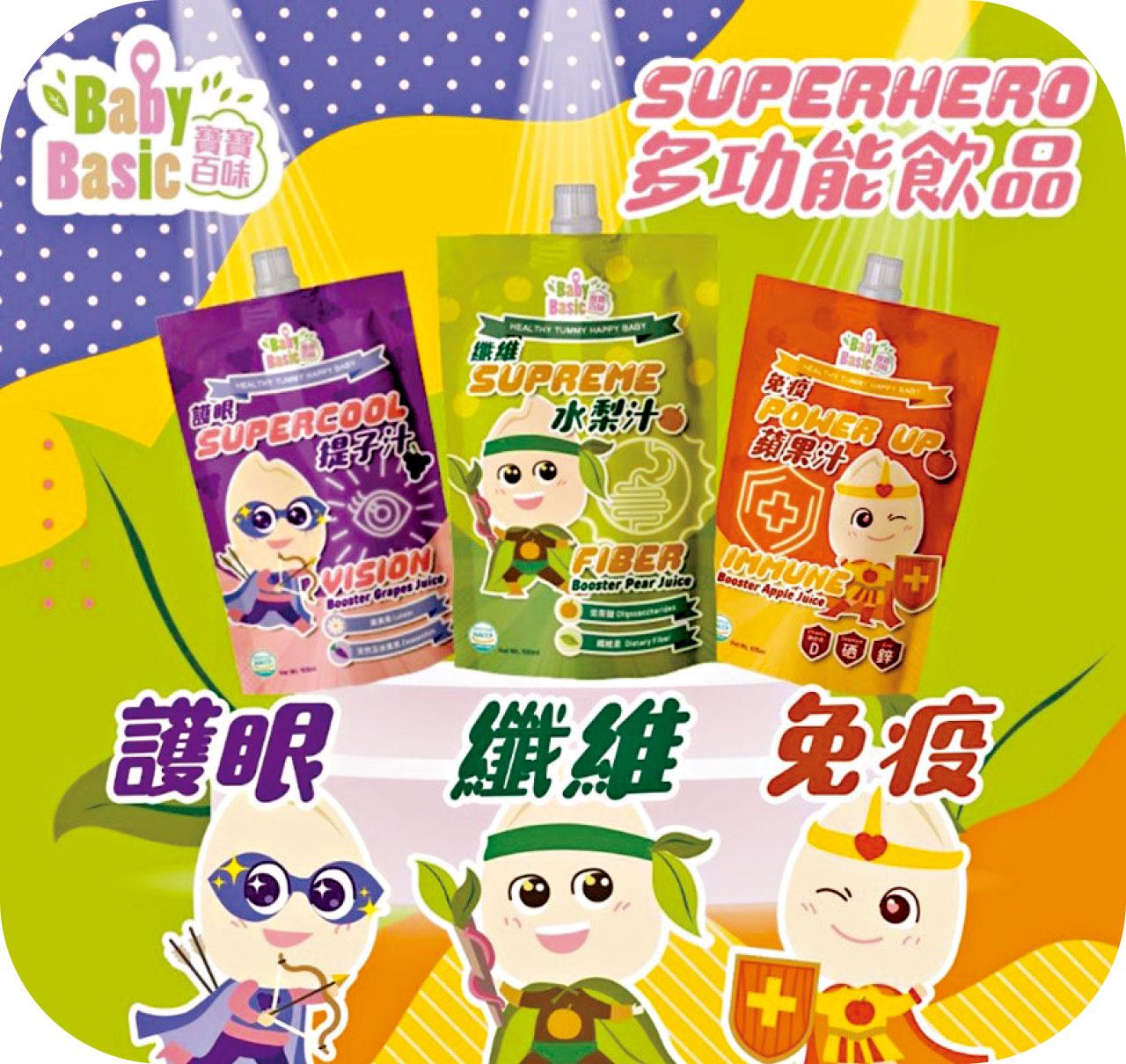 小孩保持營養充足,打好免疫力根基,自然不容易生病。以寶寶健康成長為首要目標的寶寶百味,推出了全新系列的兒童多功能飲品,適合一歲至八歲小孩飲用,包括纖維「Supreme」水梨汁、護眼「Supercool」提子汁及免疫「Power up」蘋果汁,打造「Super Hero」戰隊。每位成員各有「健康之力量」,讓小孩從果汁中輕易補充各種所需營養,有助促進腸道蠕動、預防或舒緩便秘、幫助視力發展及提升基礎免疫力等,透過協調免疫信號,提高免疫系統對細菌及病毒入侵的防禦。