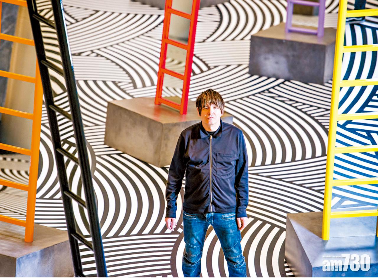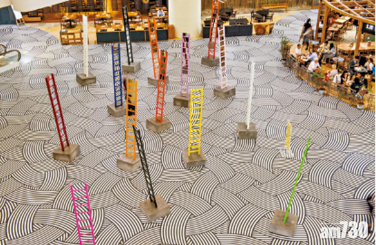 地板裝置《The Strokes》是以單色相間的膠帶交織而成的漩渦圖案,起伏連綿地覆蓋整個中庭地面。這個多層面藝術裝置,猶如黑膠唱片的螺旋紋般,有節奏地向著中心旋轉,賦予中庭新的視覺節奏。透過不斷地填滿及留白,重複再重塑,扭轉中庭原來的感覺。與黑白漩渦圖案互相襯托著的是《Shaved Ice》作反射,髹上螢光顏色的梯子從黑白色的地面延伸到天花,梯間同時嵌入了鏡子,讓色彩、形狀和空間互相交織,呈現如萬花筒般驚喜變幻的觀賞體驗,令平凡的梯子變得不一樣,讓觀者從熟悉事物中看出新觀點。