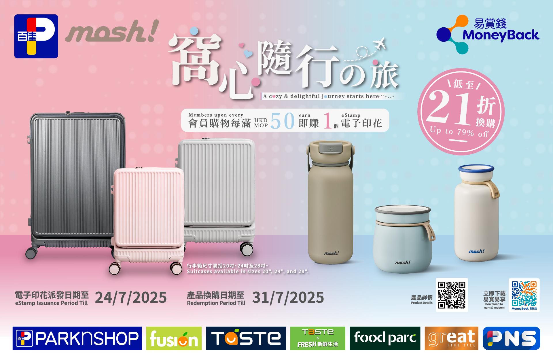 集齊印花即可換購mosh!行李箱系列及不銹鋼保溫系列,設計充滿日式簡約美學。百佳與mosh!獨家聯乘全球首推前揭式行李箱,設20吋、24吋及28吋三款尺寸選擇,到各個國家地方都可以輕鬆來往自如,滿足每個人的旅行所需。另外,mosh!不銹鋼保溫系列均採用雙層304不銹鋼真空構造,保溫時間長,方便出遠門時保溫各種飲品食物,實用又美觀。
