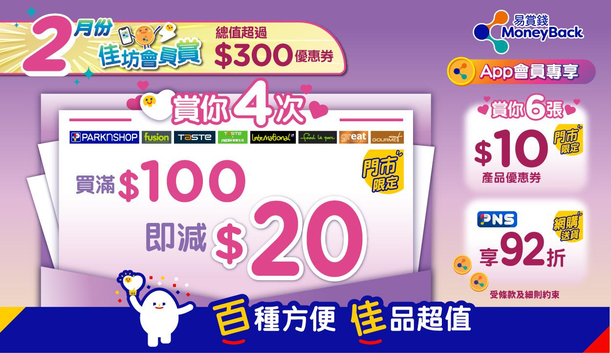 百佳2月會員優惠 買滿$100即減$20/$10優惠券/網購自取92折