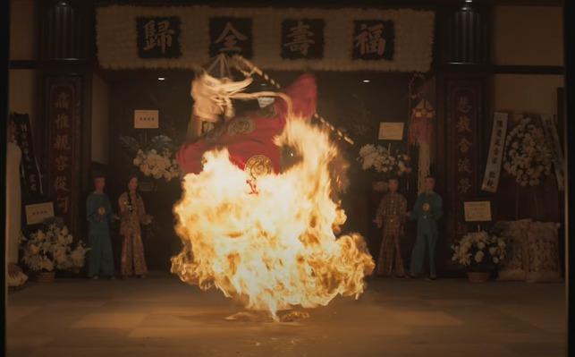 破地獄儀式中,喃嘸師傅會口含清水噴向火盆,隨即躍起越過翻騰的火舌,稱為「跳油鑊」,寓意帶領亡者脫離地獄火海,走向輪迴之路。(圖片來源:《破·地獄》劇照)