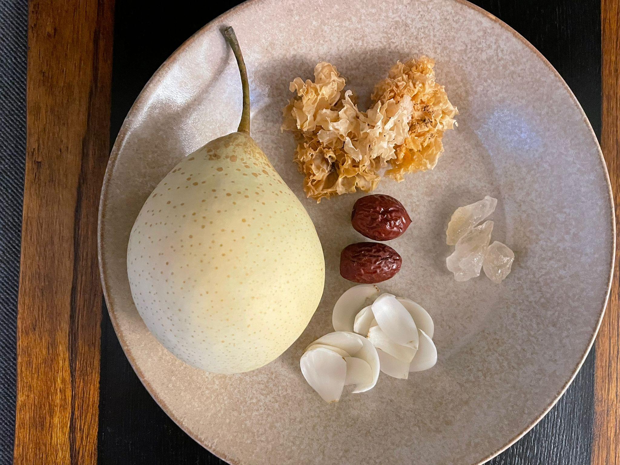 雪梨一個、雪耳6克、鮮百合9克、紅棗2粒、冰糖適量。